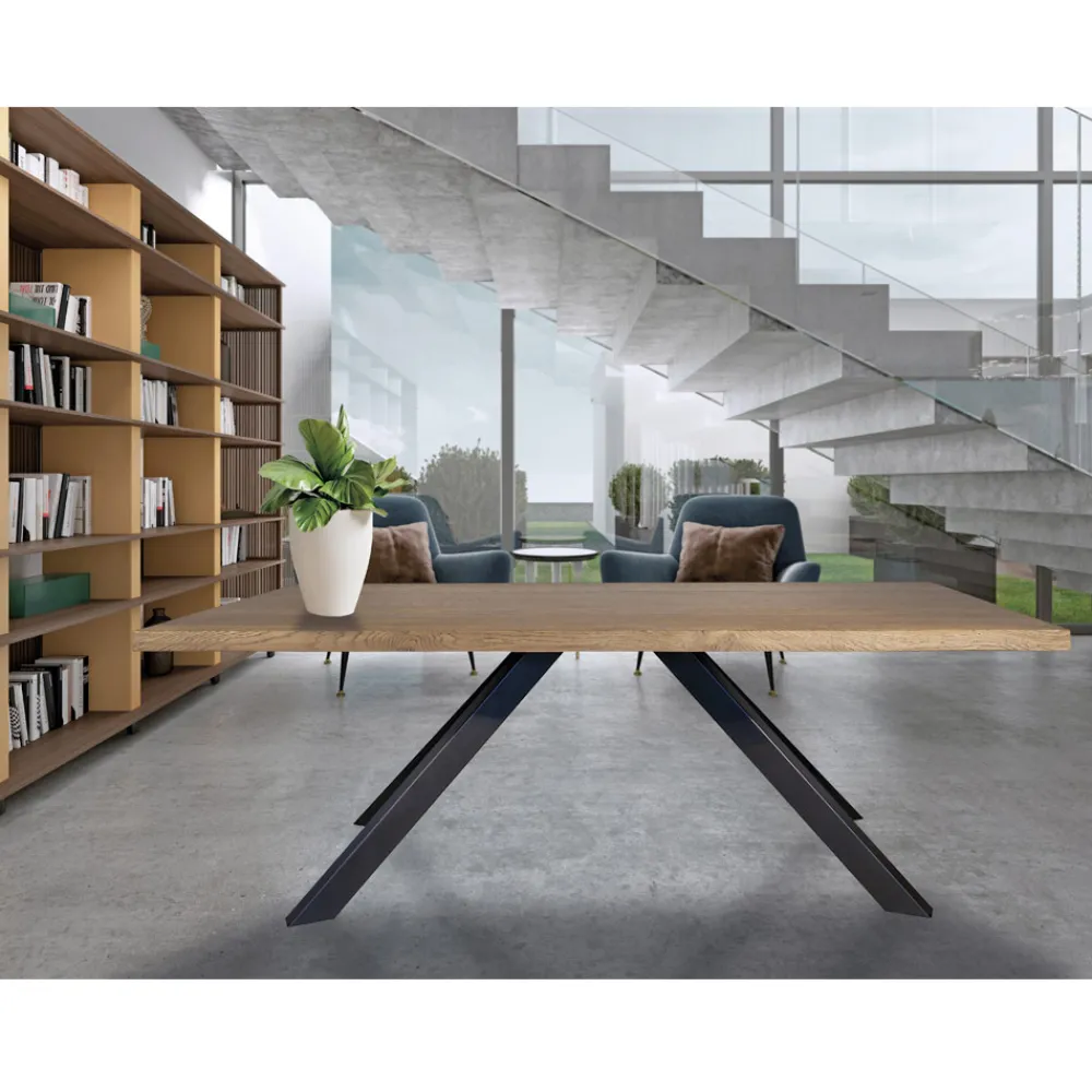 Holztisch aus entrindetem, geknotetem Eichenfurnier und Metallgestell Made in Italy.