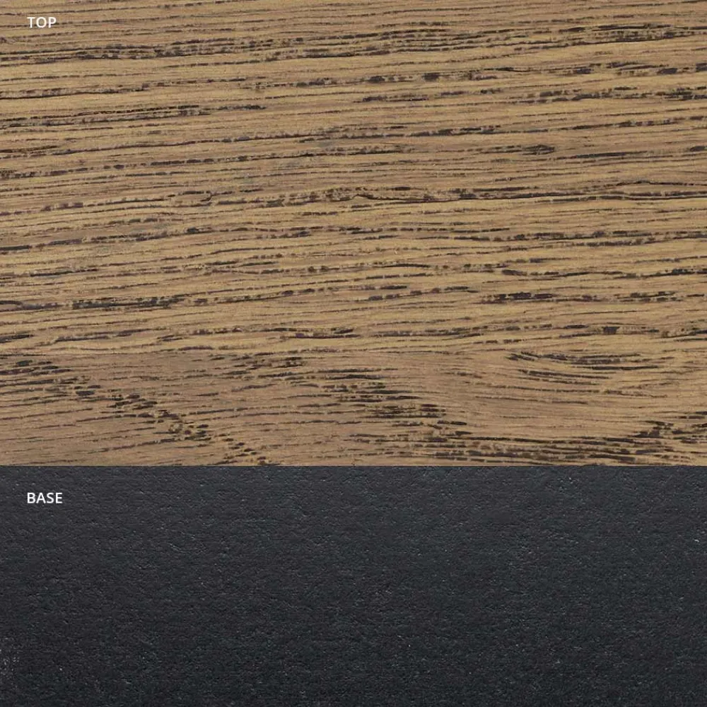 Die Platte dieses Tisches ist aus geknotetem Eichenfurnier in Scotch-Farbe und die Basis aus mattschwarzem Metall.