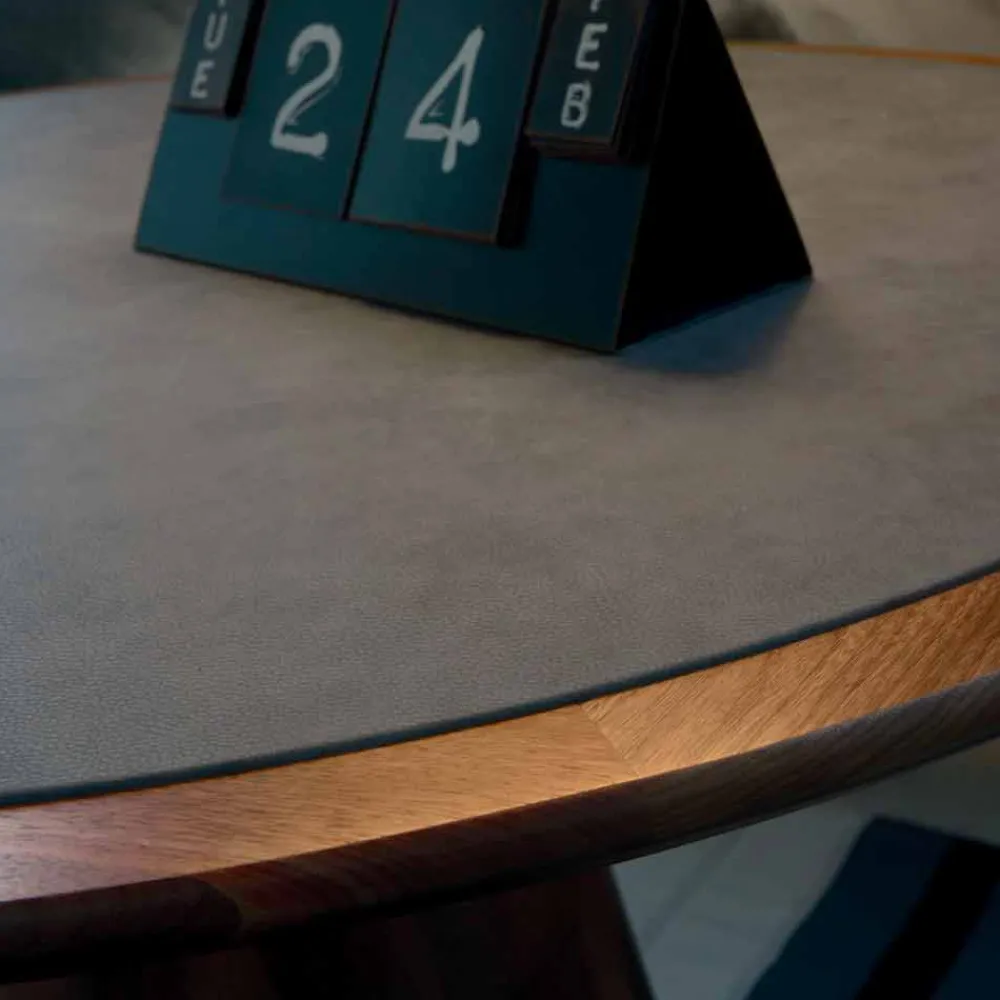 Fester runder Tisch mit massiver Walnussplatte. Sockel aus massiv gedrechseltem Canaletto-Walnussholz. Carlo verfügt über klare Gesichtszüge und Linien, die seinen Wert steigern. Aus natürlichem Walnussholz gefertigt und mit Öl behandelt, zeigt er seine besondere stilistische Raffinesse durch die Form des Sockels und der mit Öko-Leder bezogenen Oberseite.