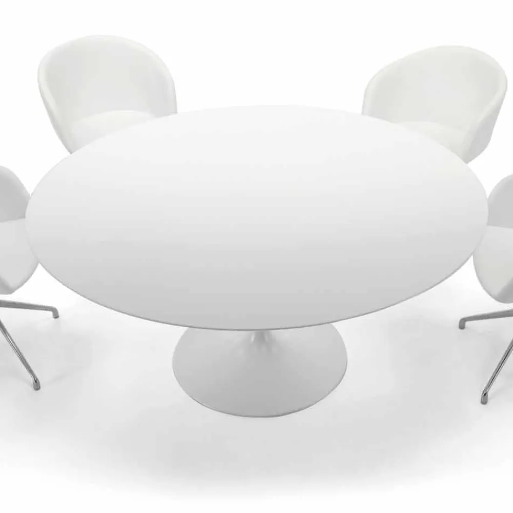 Moderner runder Esstisch mit flüssiger Laminatplatte und Aluminiumbasis, hergestellt in Italien.