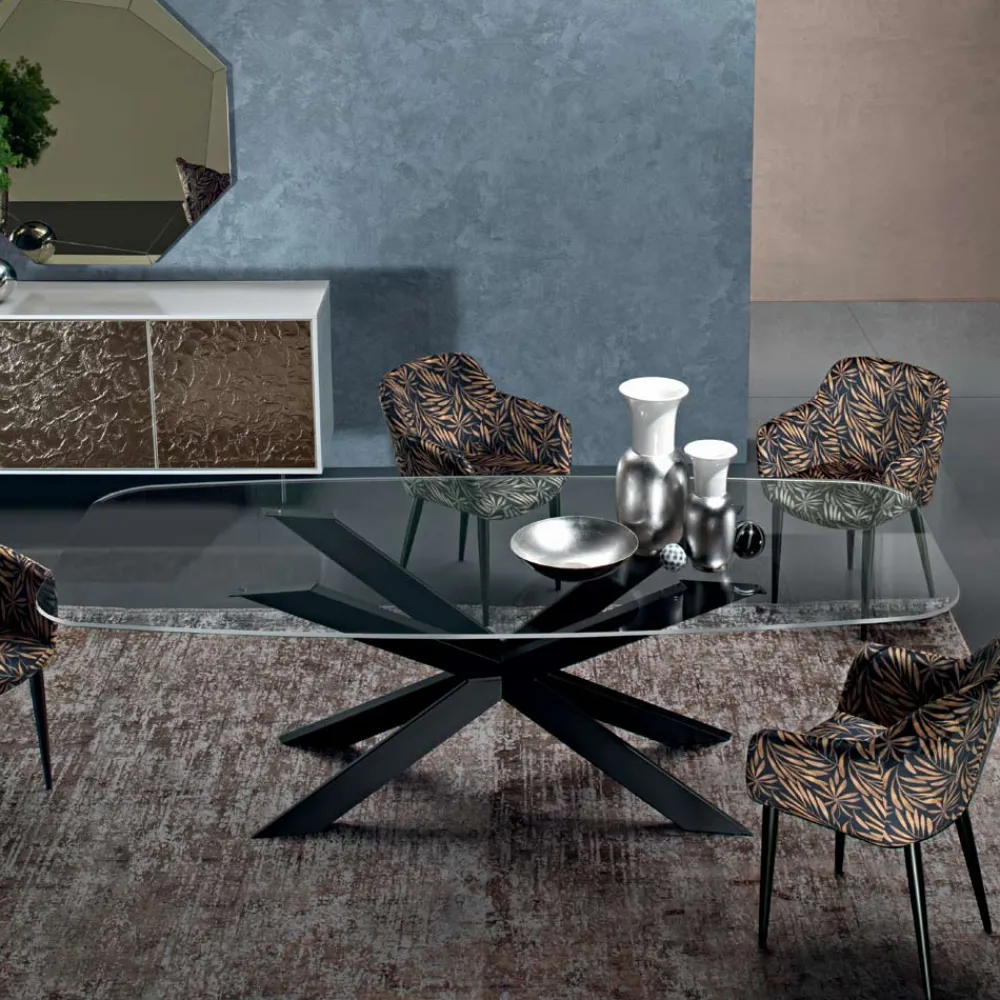 In Italien hergestellter Esstisch mit tonnenförmiger Platte aus transparentem, extraklarem Hartglas (12 mm dick) und lackiertem Stahlgestell . Ein raffiniertes Einrichtungsaccessoire, das dank seines faszinierenden Designs und seiner originellen Form die Aufmerksamkeit auf sich zieht und jeder modernen Einrichtung eine exklusive Note verleiht. Die herrliche Kombination aus der zeitlosen Eleganz von Glas und der originellen Form der Fassplatte erweckt einen Esstisch mit einer raffinierten Seele zum Leben, der den umgebenden Stil mit einer einzigartigen und modernen Note vervollständigt. So entsteht eine Einrichtungslösung mit klassischer Ästhetik, ideal für diejenigen, die einen anspruchsvollen Geschmack lieben, aber nicht auf grundlegende Aspekte wie Qualität und Langlebigkeit verzichten möchten.