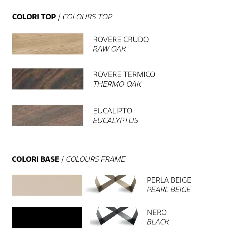 Tisch für den Innenbereich mit Platte aus Eichenfurnier und Untergestell aus lackiertem Metall.