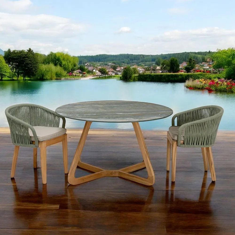 Hier ist ein Esstisch, der zeitlose Eleganz verkörpert, ideal für diejenigen, die einen Hauch von Klasse in den Indoor und Outdoor Raum bringen wollen. Der Tisch mit seiner runden Keramikplatte erinnert an die ruhigen Wellen eines Alpensees und bietet nicht nur eine praktische Oberfläche, sondern auch ein echtes Gesprächsthema. Der Holzsockel sorgt für tadellose Stabilität, kombiniert mit einer skulpturalen Form, die sich organisch und einladend in die Umgebung einfügt. Dieser Esstisch ist die perfekte Wahl für diejenigen Einrichtungsprofis, die Stücke suchen, die die Sprache von Made in Italy , handwerklicher Qualität und Dauerhaftigkeit sprechen. Perfekt für Umgebungen, die Gelassenheit und Gastfreundschaft ausstrahlen sollen, passt es sich mit Vielseitigkeit sowohl an ein einsames Frühstück am frühen Morgen als auch an ein festliches Bankett unter den Sternen an.
