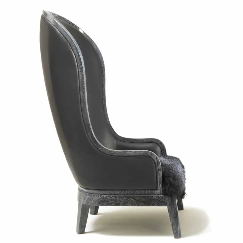 Sessel mit hoher Rückenlehne. Rückseite mit schwarzem Leder bezogen. Sitz mit schwarzem Tibet Lammhaar bedeckt. Holzrahmen und Sockel. Finish in schwarzer Eiche.