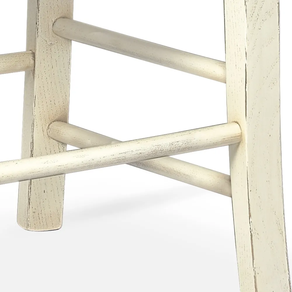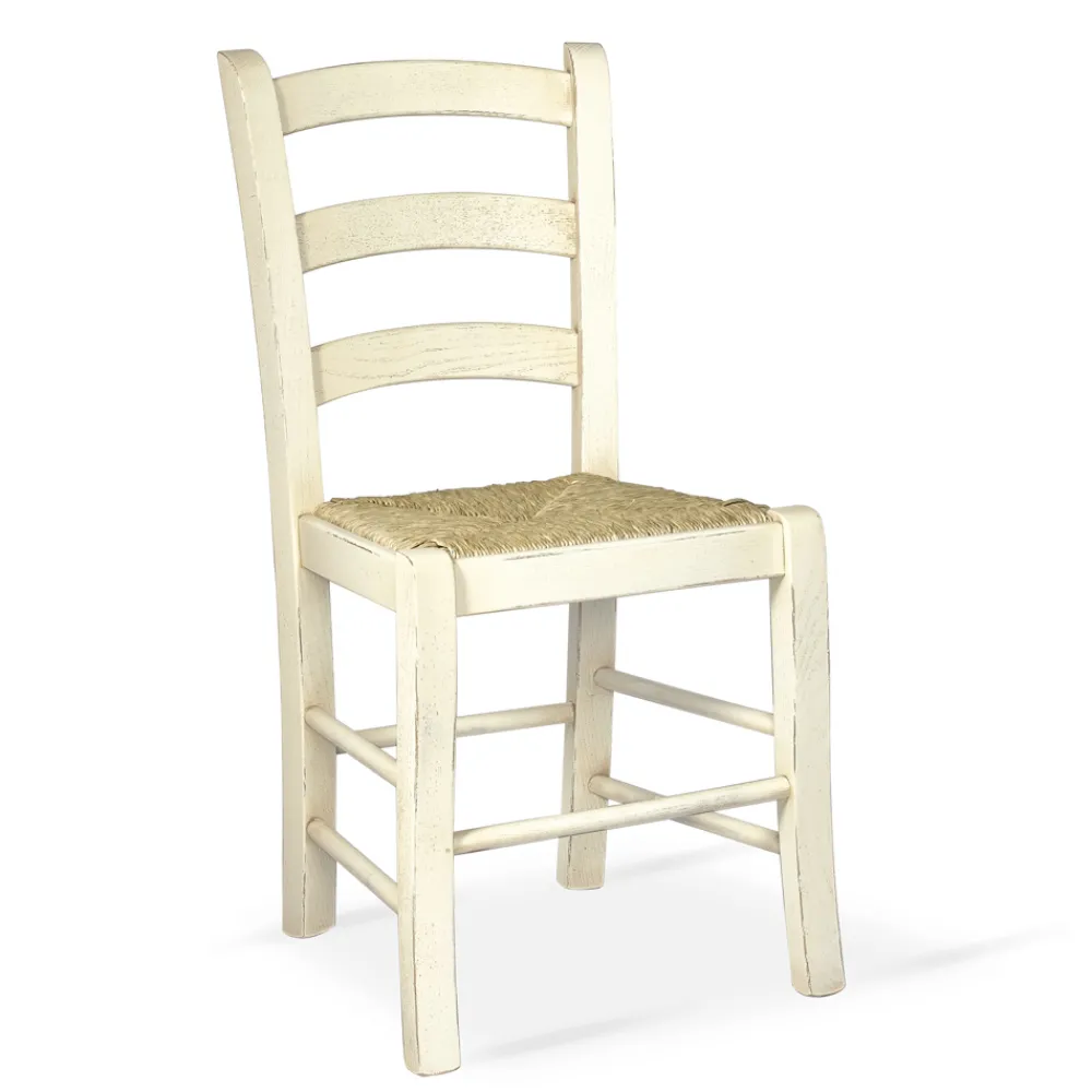 Esszimmerstuhl mit Struktur aus elfenbeinfarben gebeizter, lackierter Esche und Sitzfläche aus Stroh .