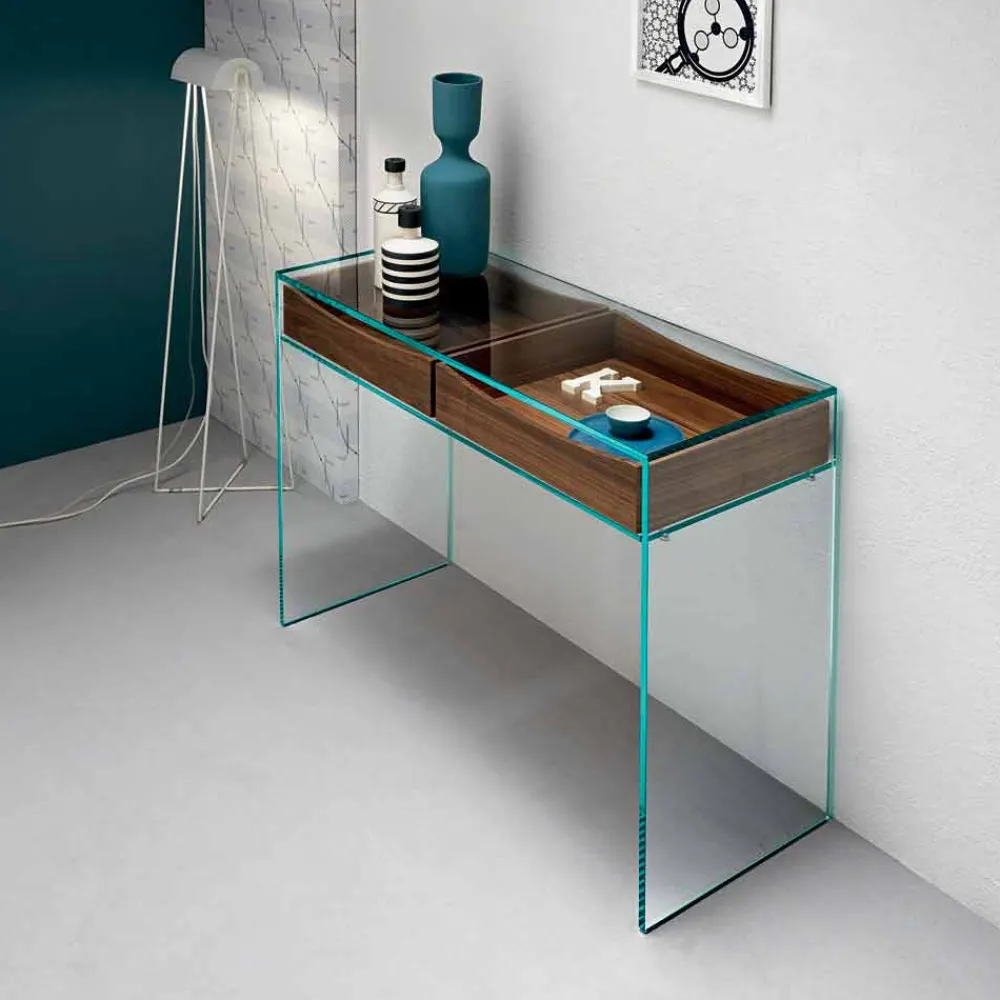 Konsole im minimalistischen Design aus extra klarem Glas und Holzschubladen, Luxus made in Italy.