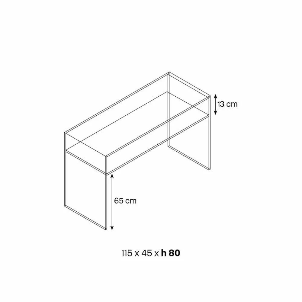 Die Konsole ist ein in verschiedenen Kontexten quer einsetzbares Möbelstück mit einer schlichten und geradlinigen Brückenstruktur aus extra klarem Glas mit zwei darunter liegenden Schubladen in Nussbaum Canaletto.