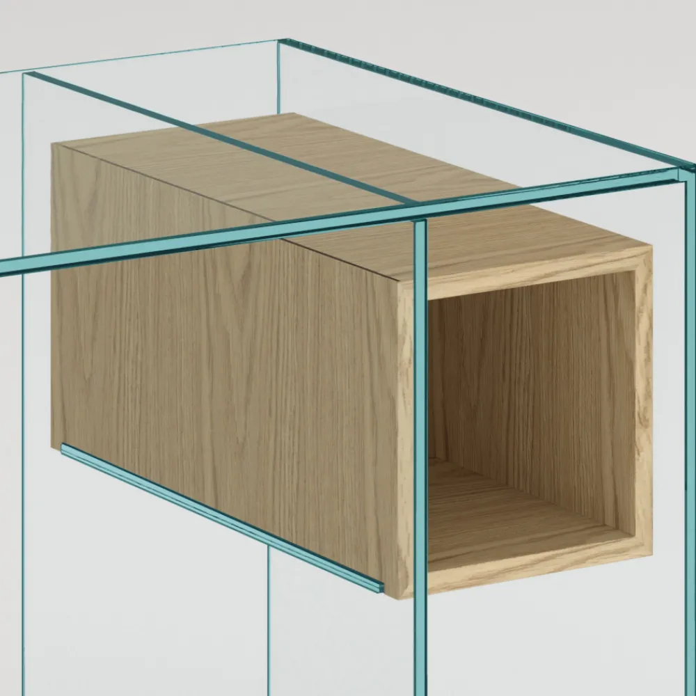 NB : die Konsole ist auch in der Version mit Rauchglas erhältlich. Es ist auch möglich, das 3er-Set Schubladen in einer passenden Ausführung (eingefügt in den linken Würfel) anzufordern.