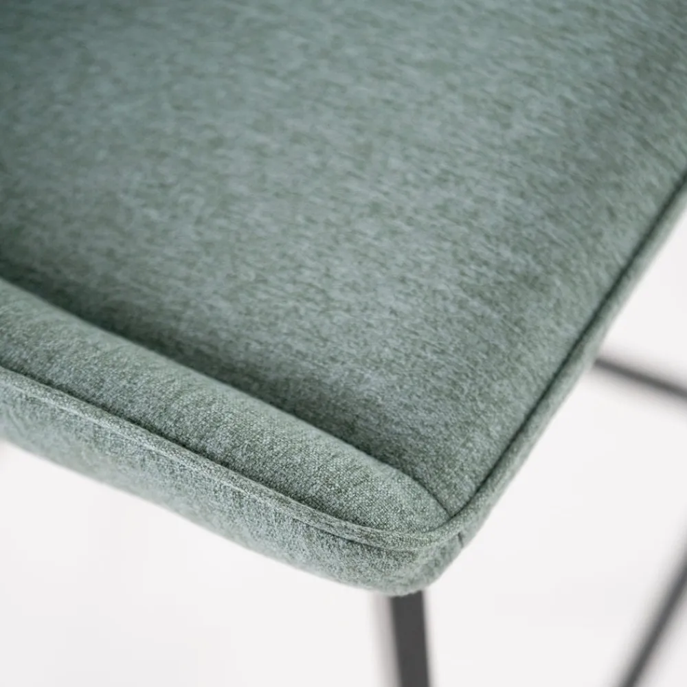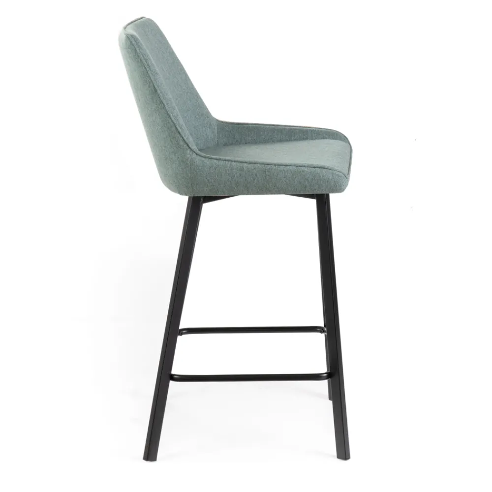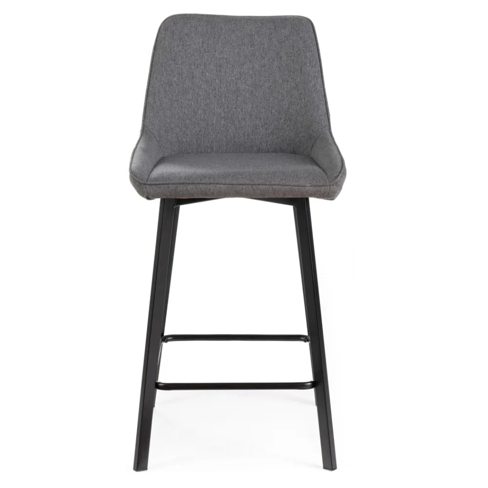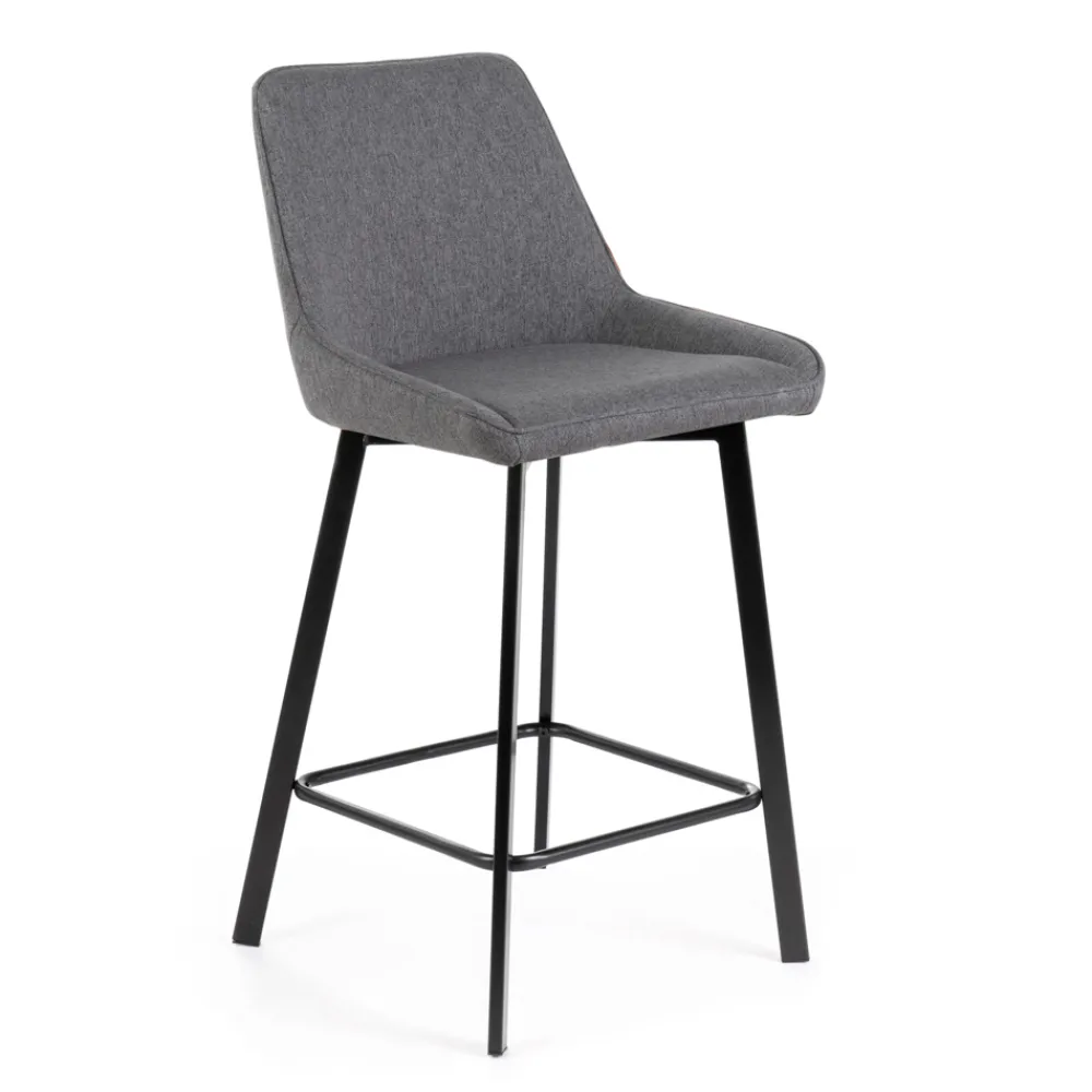 Dieser Hocker möchte die Form des traditionellen Esszimmerstuhls annehmen, übersetzt seine Form jedoch in etwas ausgesprochen Einzigartiges. Rückenlehne und Sitzfläche sind beide mit weichem Stoff bezogen, während die in die Struktur integrierte Fußstütze für mehr Komfort sorgt. Dadurch eignen sich diese Möbel ideal für eine moderne offene Küche mit Halbinsel oder für einen Wohnbereich mit Bartresen.