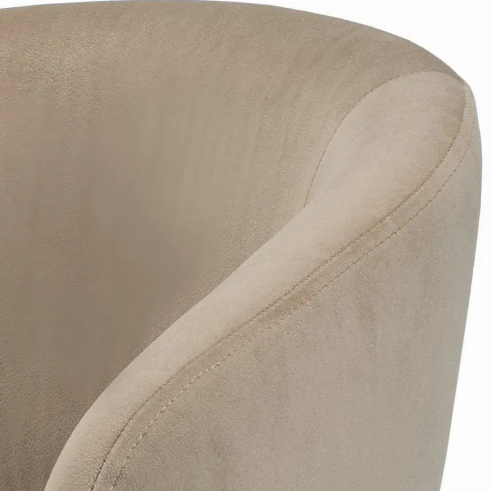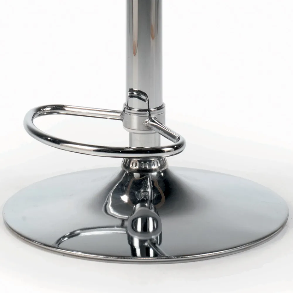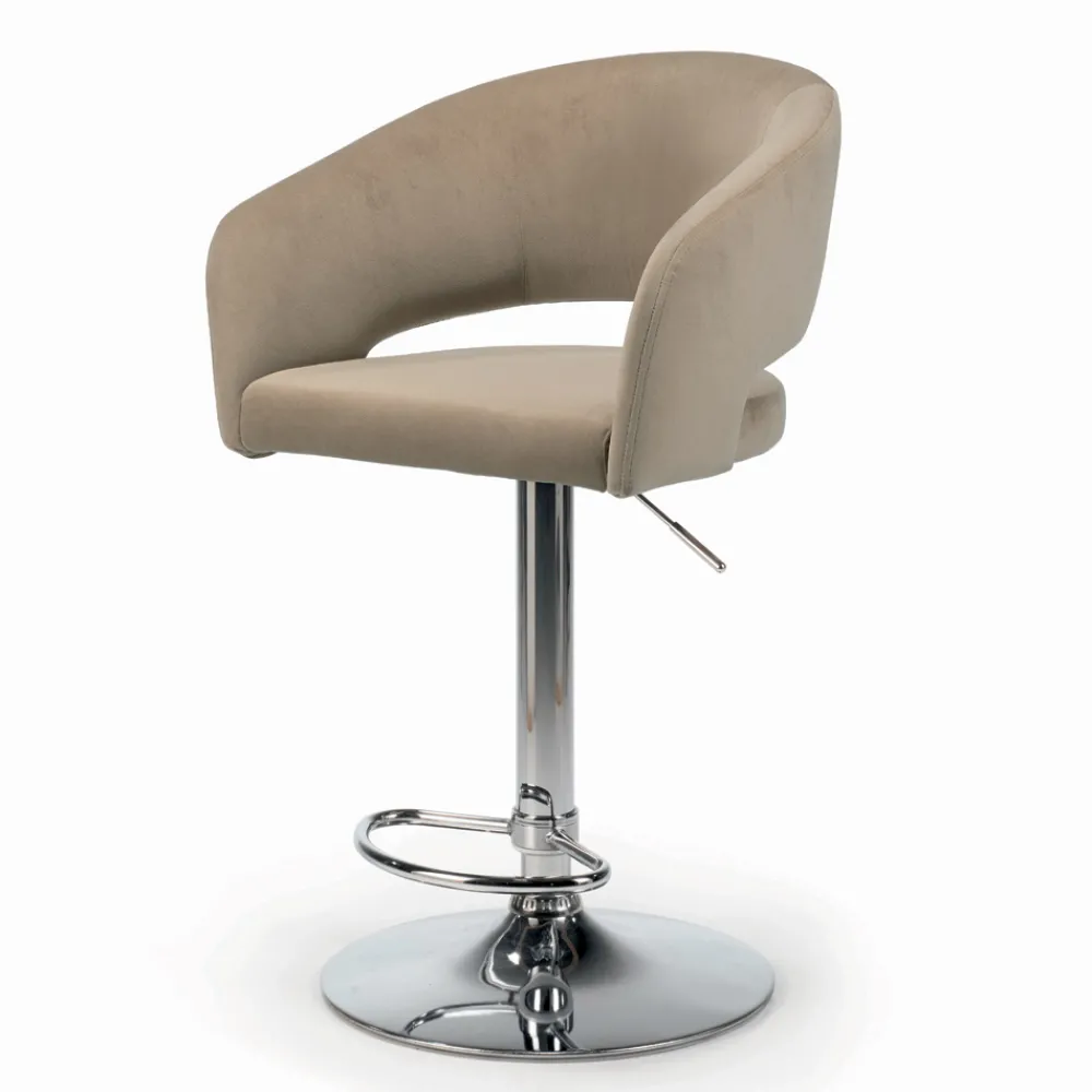 Drehbarer und höhenverstellbarer Wohnzimmerhocker mit vollständig bezogener Sitzfläche und Rückenlehne aus Stahl sowie Stahlgestell.