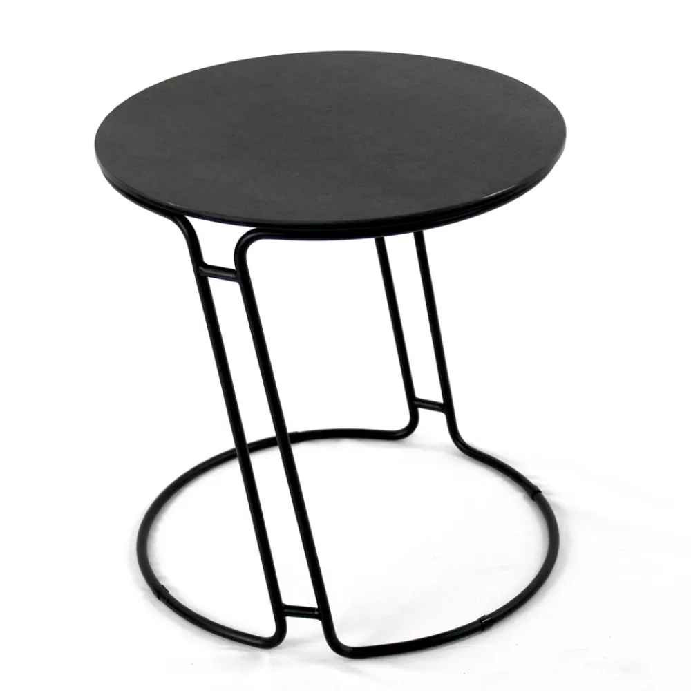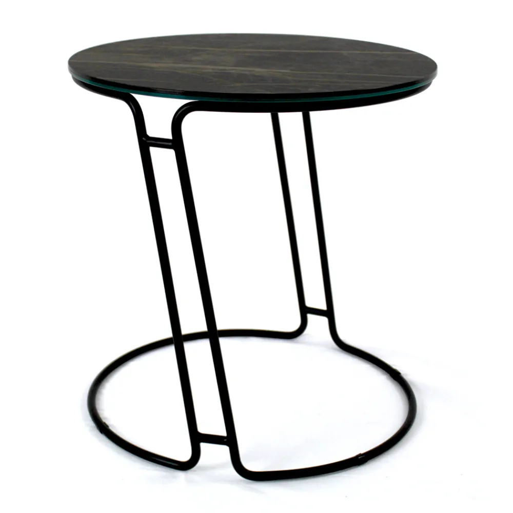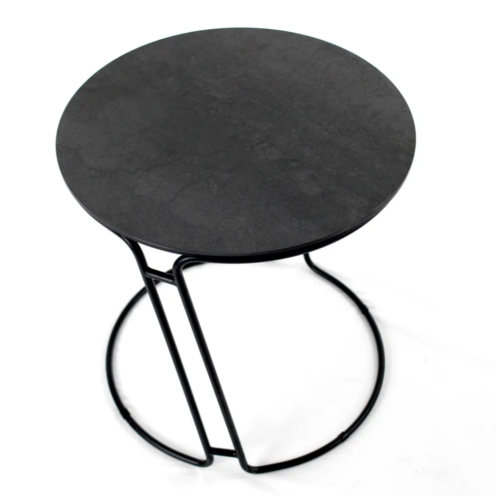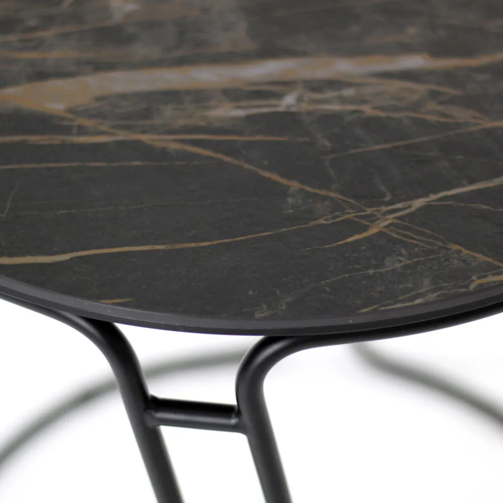 Runder Couchtisch mit lackiertem Stahlsockel und Platte aus Feinsteinzeug.