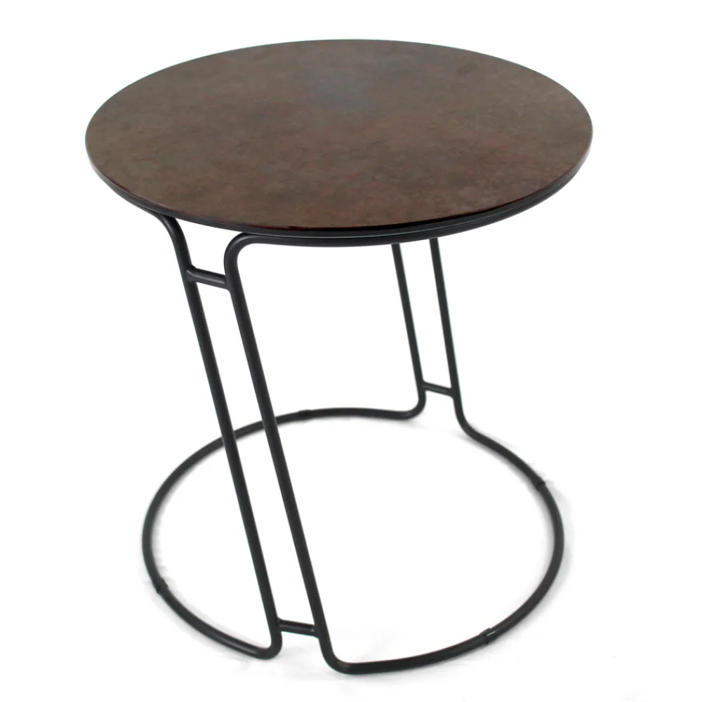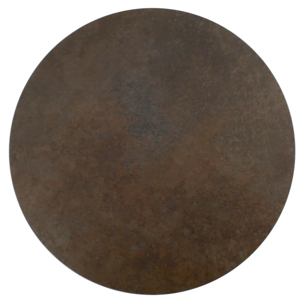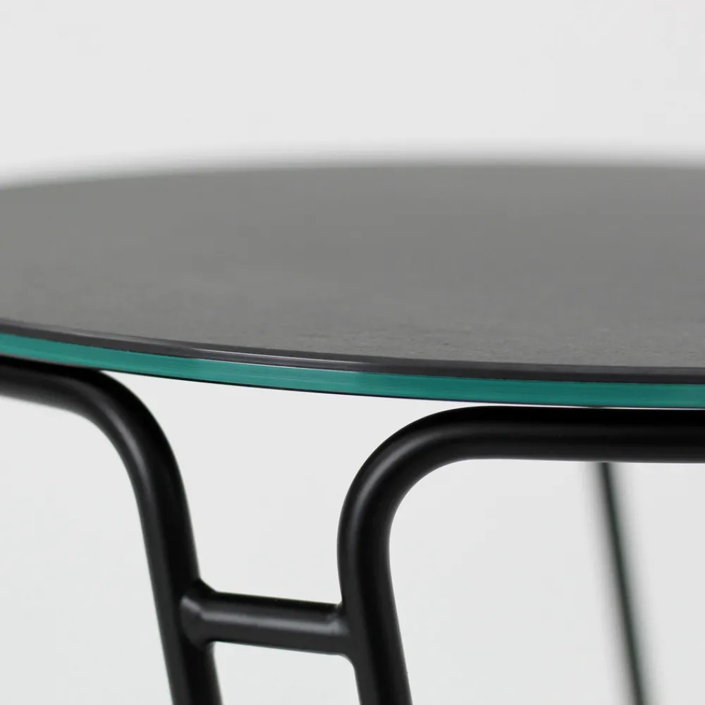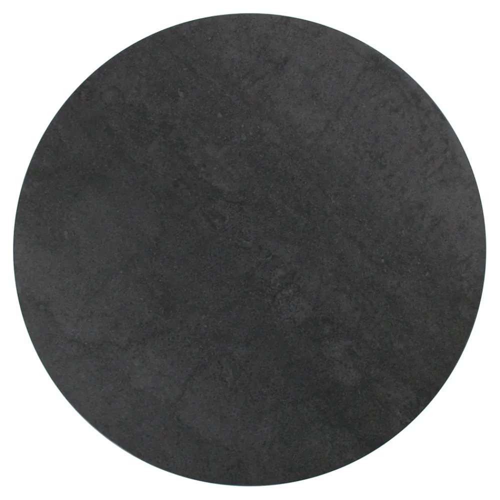 Runder Couchtisch mit lackiertem Stahlsockel und Platte aus Feinsteinzeug.