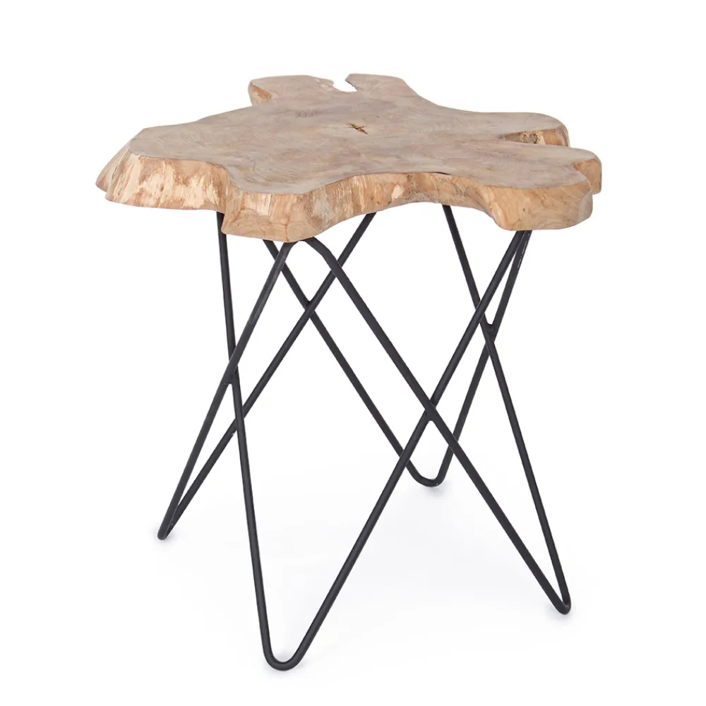 Dieser Wohnzimmer-Couchtisch besteht aus einem Boden aus Teakholzwurzeln mit einem natürlichen Finish Und Beine aus epoxidpulverbeschichtetem Stahl.