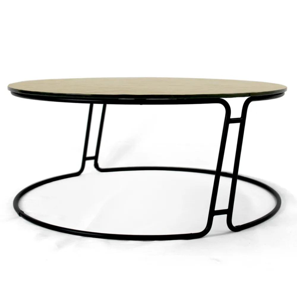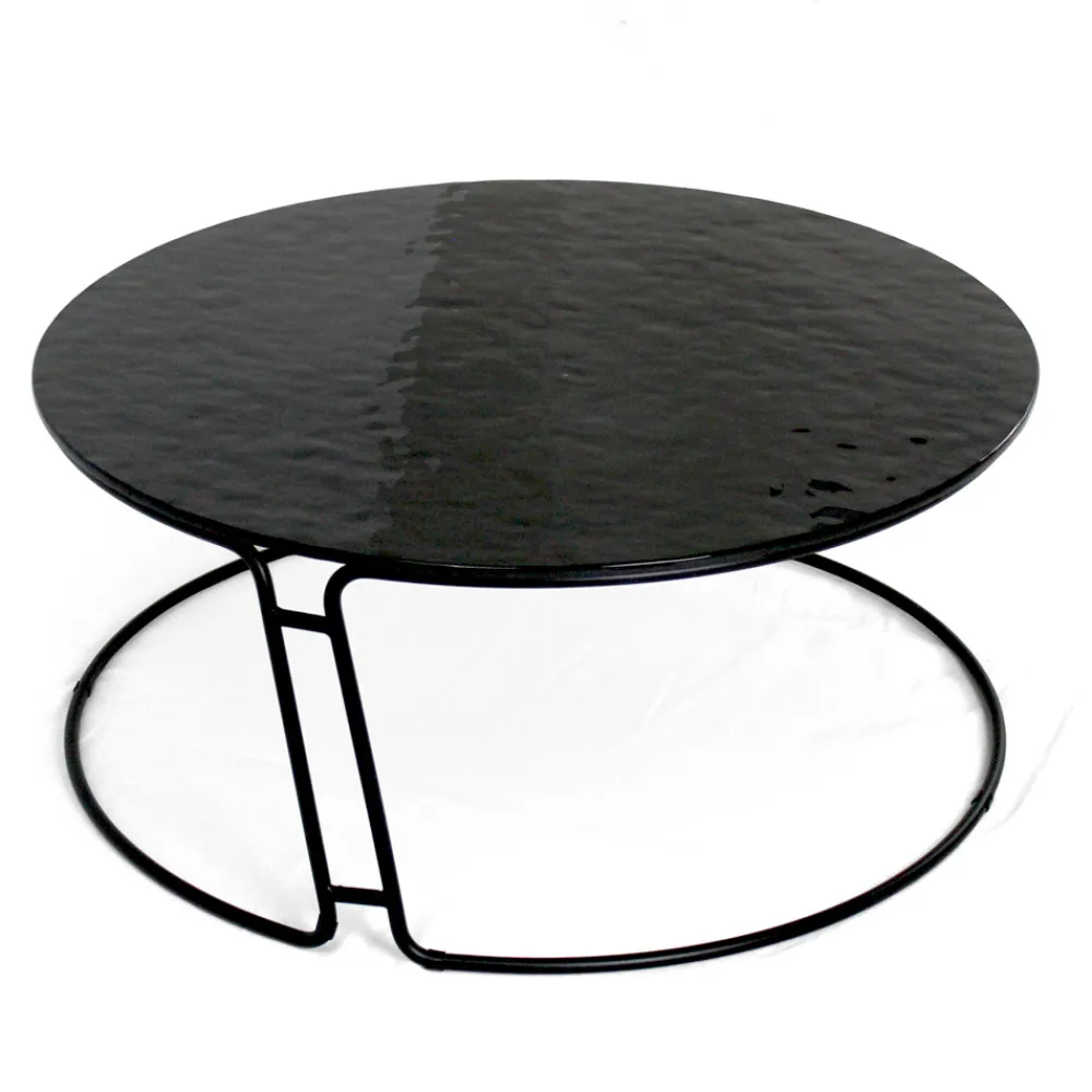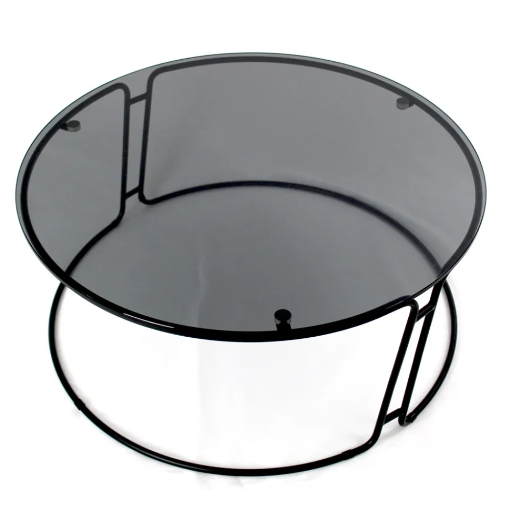 Runder Couchtisch mit lackiertem Stahlsockel und Glasplatte.