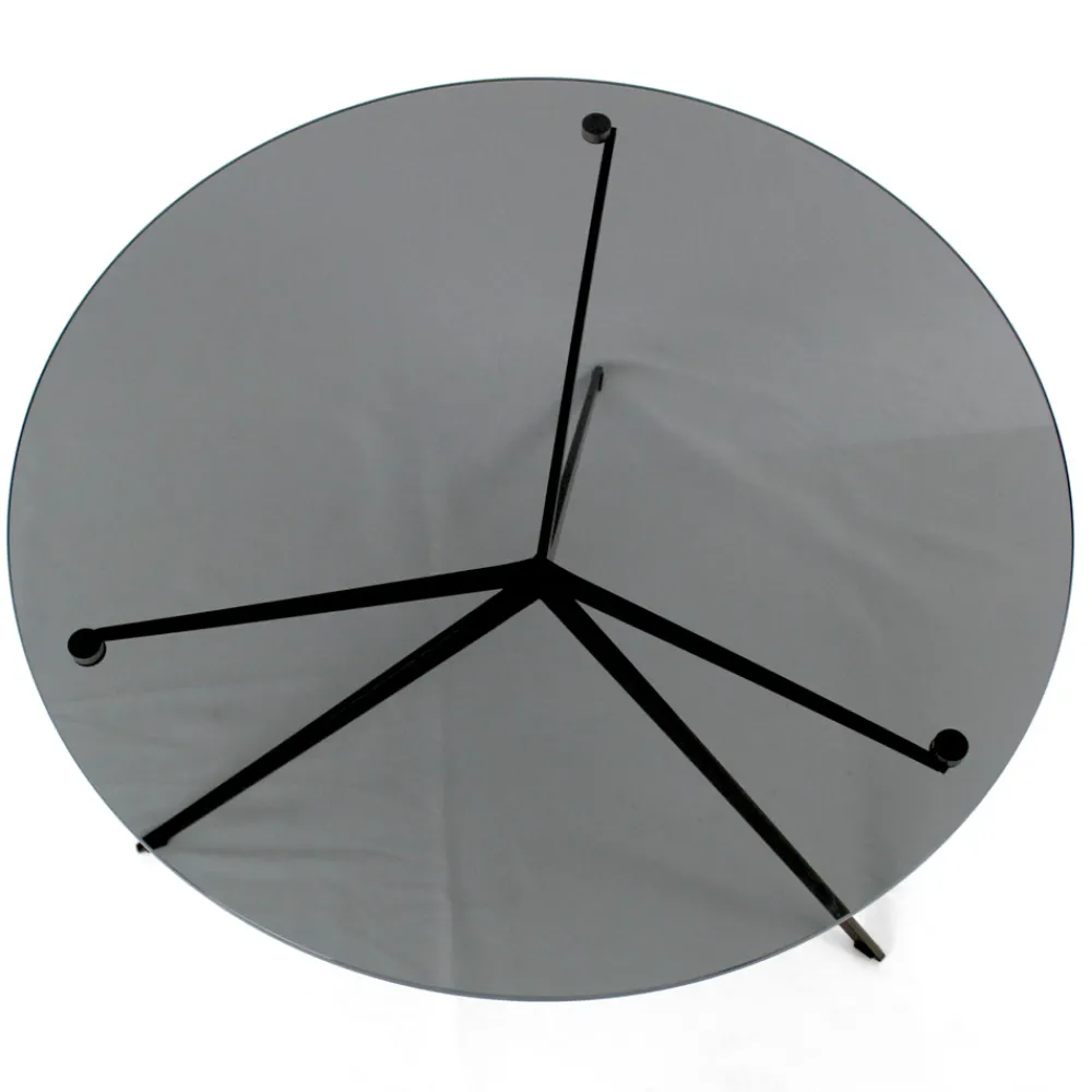 Runder Couchtisch mit lackiertem Stahlsockel und Glasplatte.