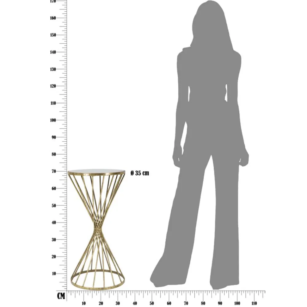 Couchtisch mit goldfarbener Eisenstruktur und runder Spiegelplatte . Ein Möbelstück mit einem einfachen und vielseitigen Design, das jedes Wohnzimmer elegant vervollständigt und ein exklusives und raffiniertes Ergebnis erzielt . Seine Besonderheit ist die wunderbare Formgebung der Struktur, die sich durch eine Sanduhrform in die Höhe entwickelt und die runde Spiegelplatte trägt und ihre anspruchsvolle Ästhetik unterstreicht.