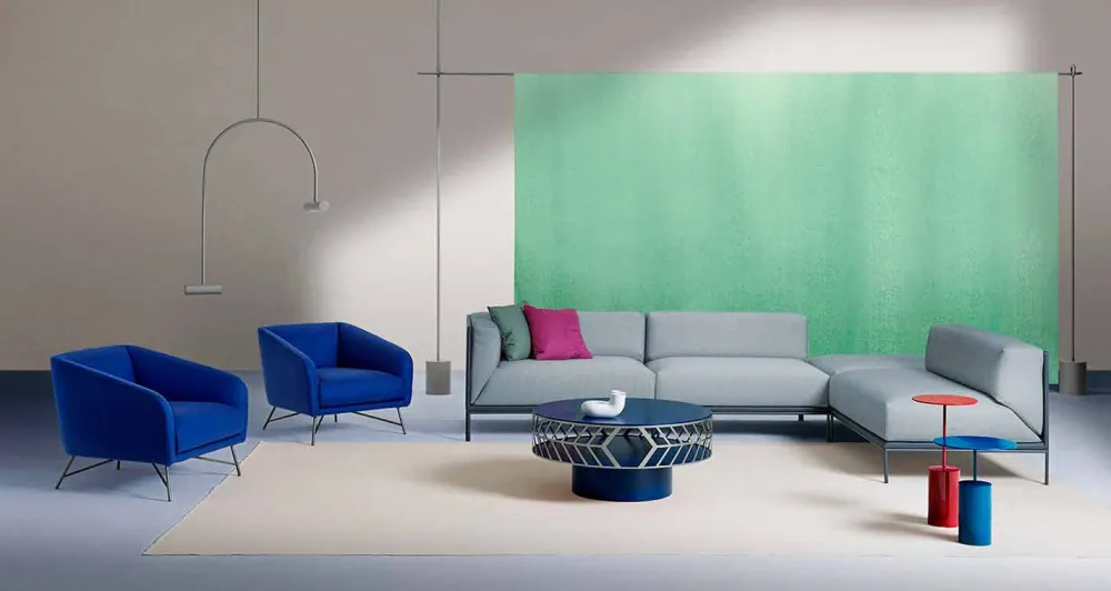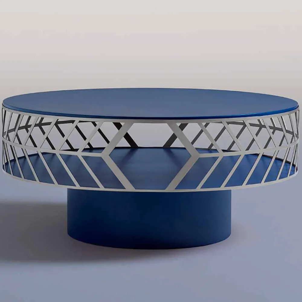 Wohnzimmer-Couchtisch aus farbigem MDF mit Stahlring in modernem und originellem Design, hergestellt in Italien.