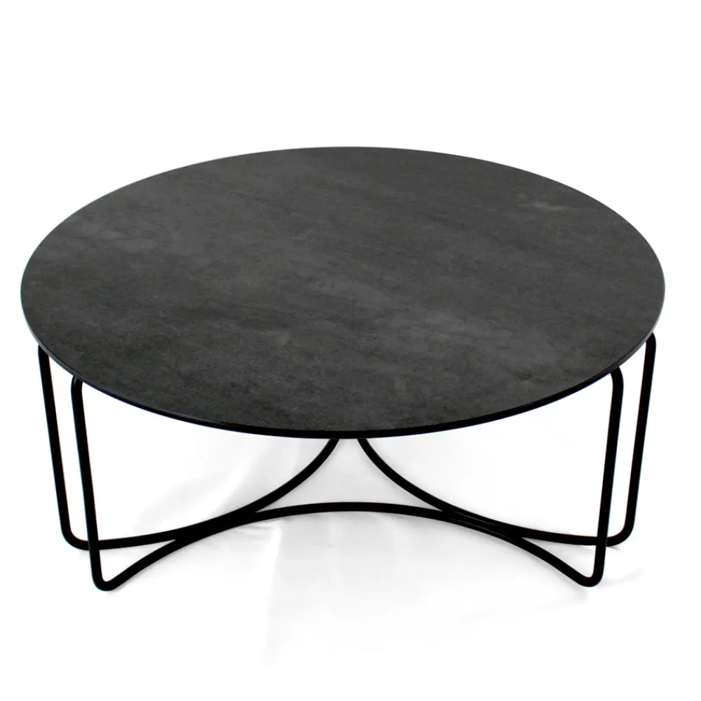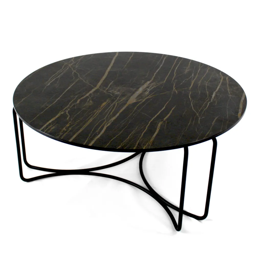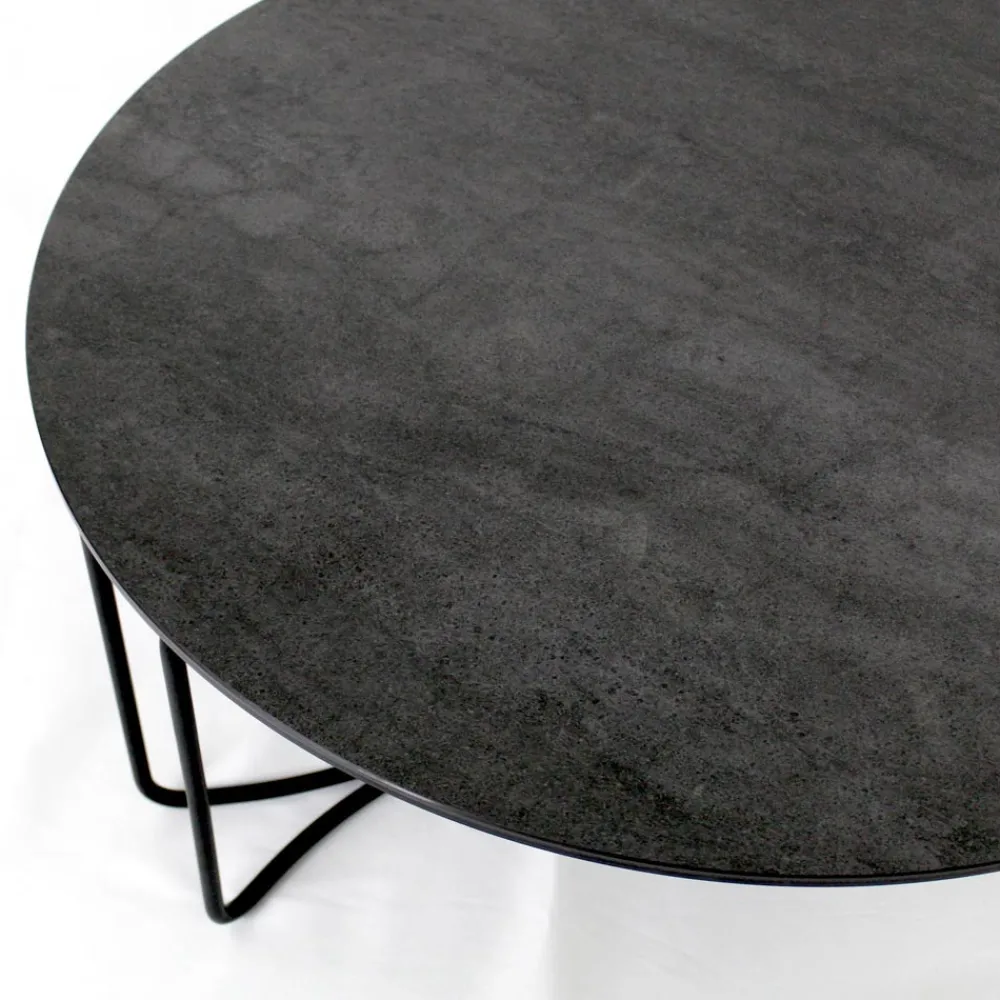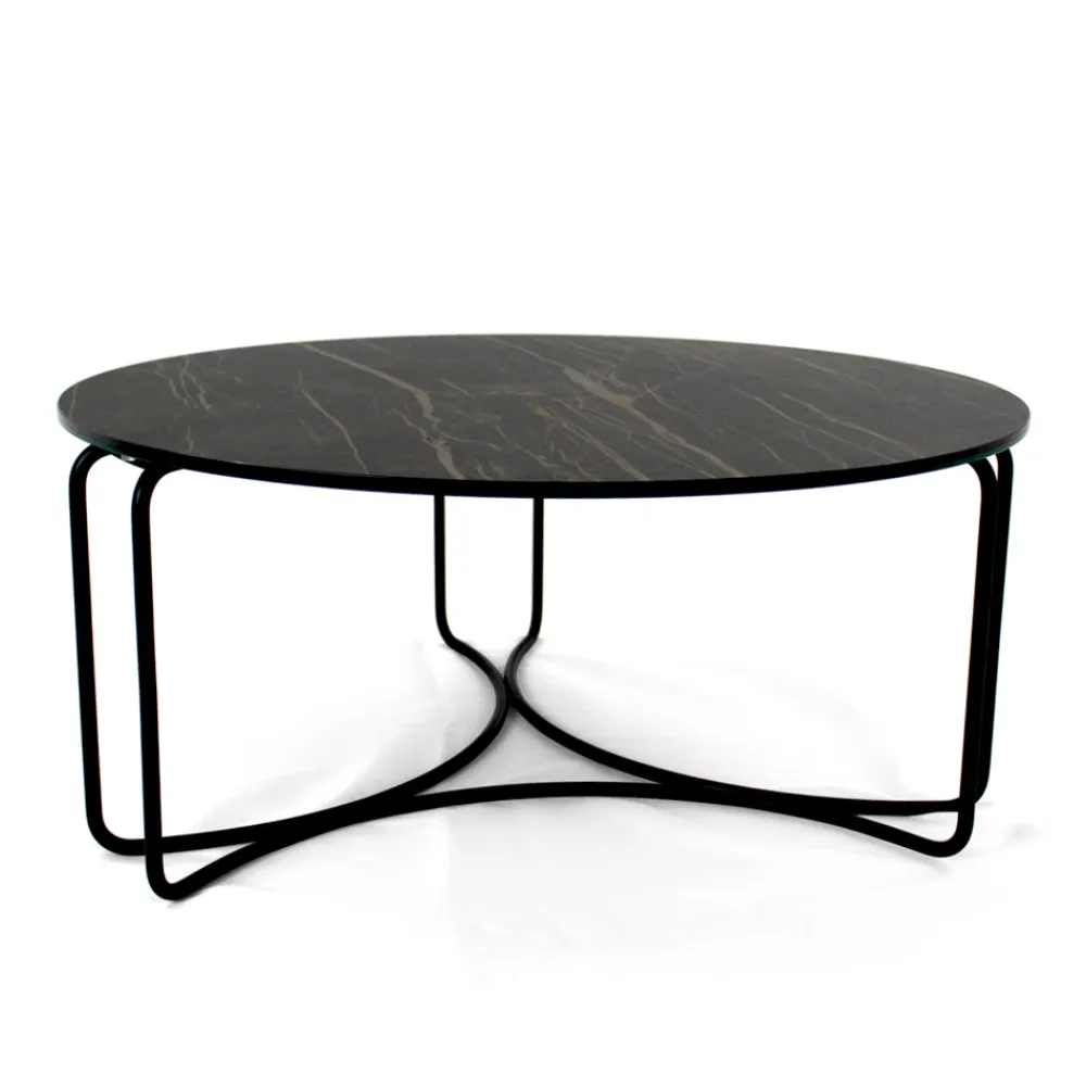 Runder Couchtisch mit lackiertem Stahlsockel und Platte aus Feinsteinzeug.
