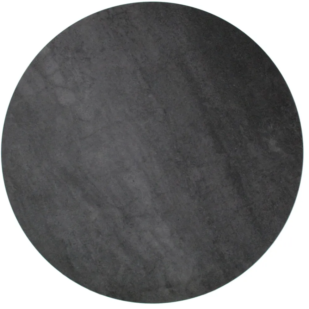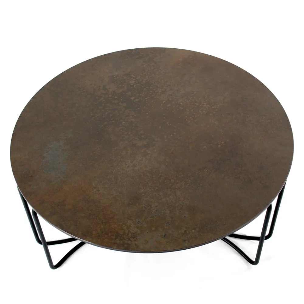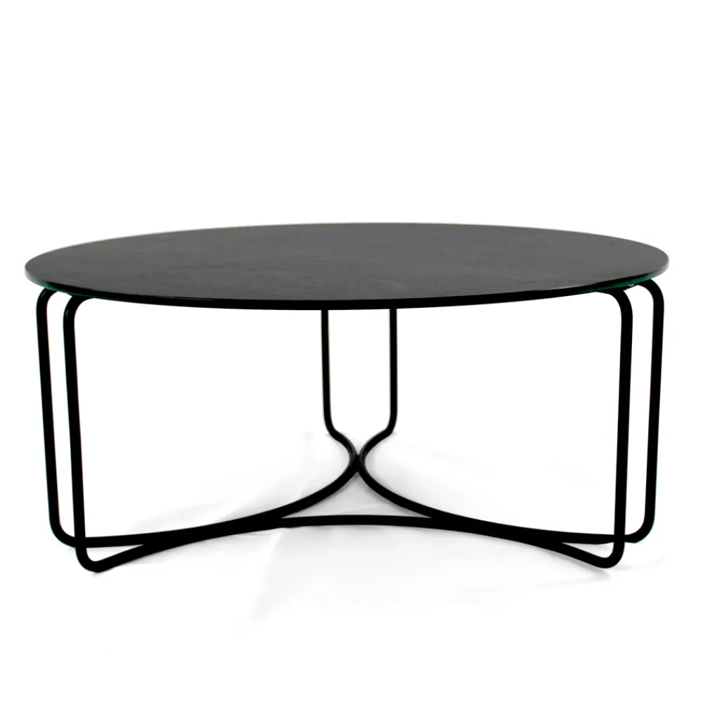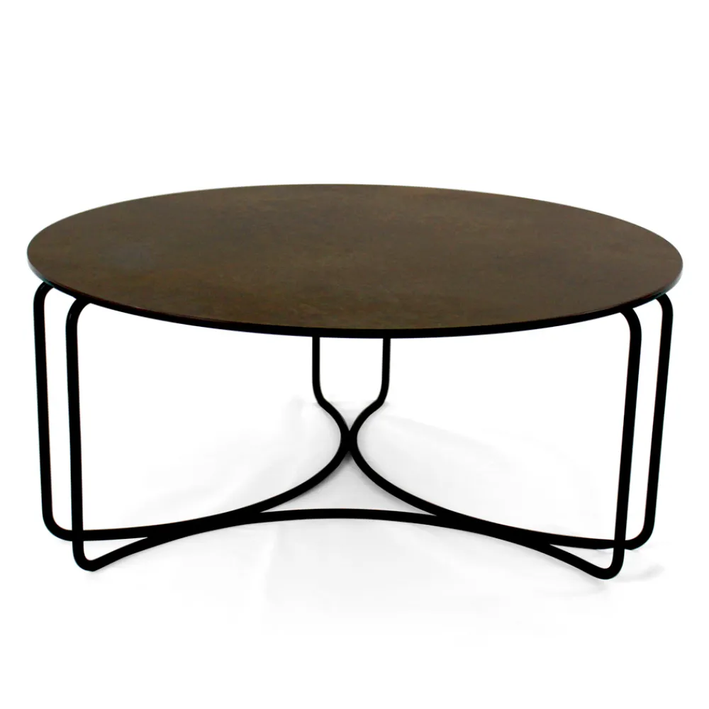 Runder Couchtisch mit lackiertem Stahlsockel und Platte aus Feinsteinzeug.
