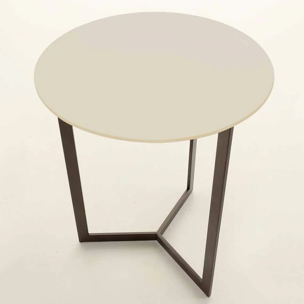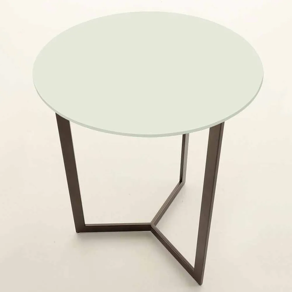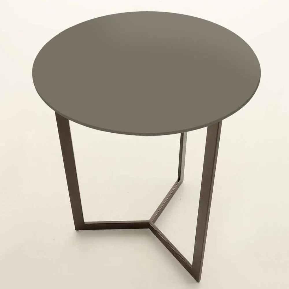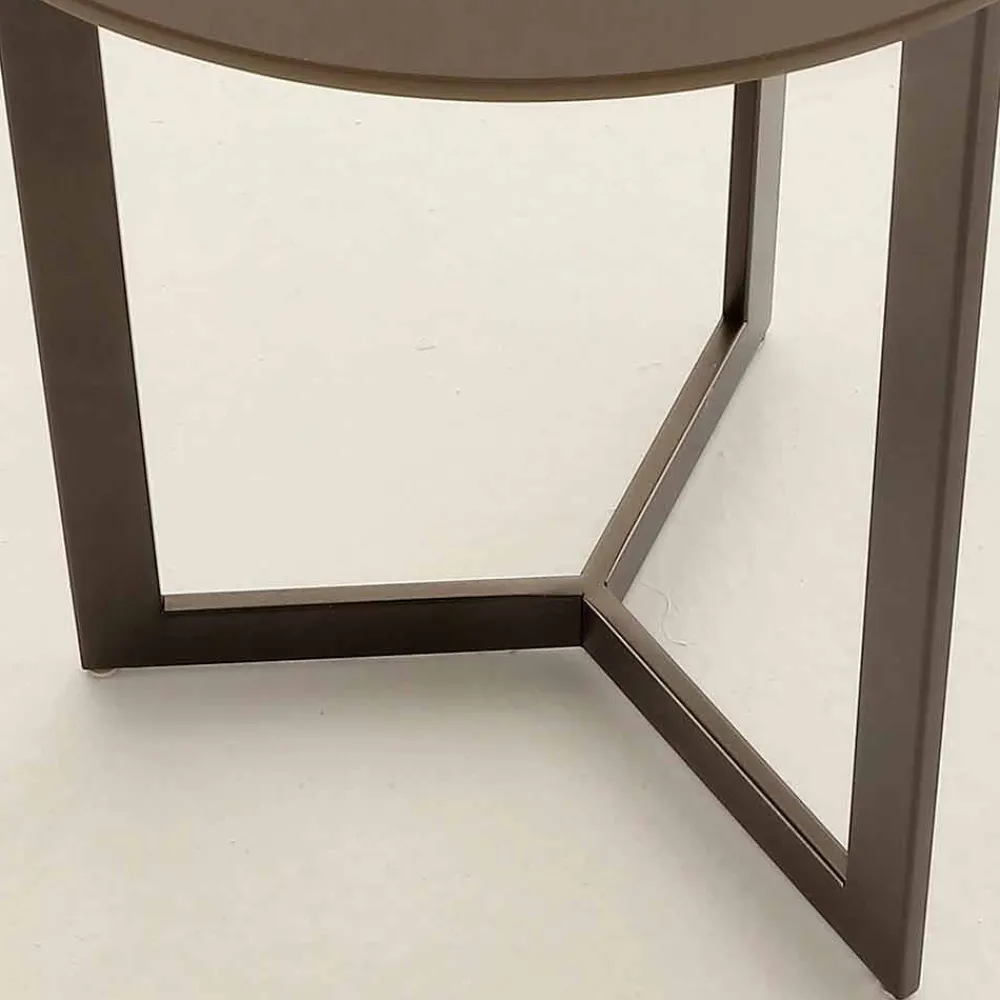 Einfacher und eleganter Couchtisch aus Italien mit runder Platte aus Satinglas gegen Fingerabdruck und Struktur aus braun lackiertem Metall .