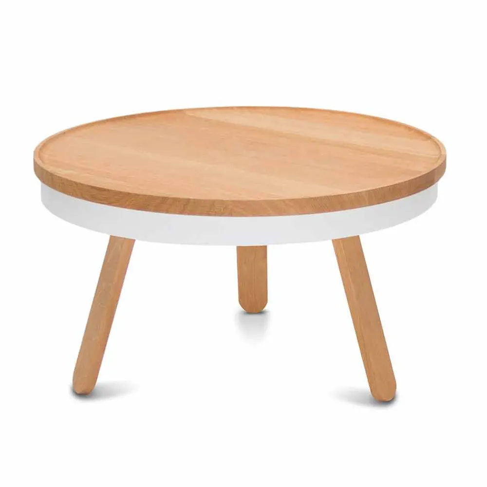 Runder Couchtisch aus Massivholz und Stahl mit Ablagefach.