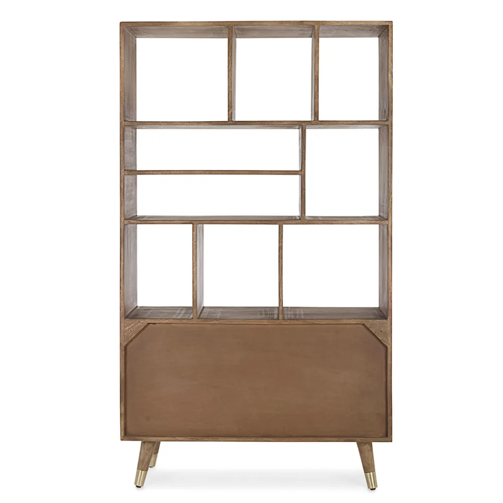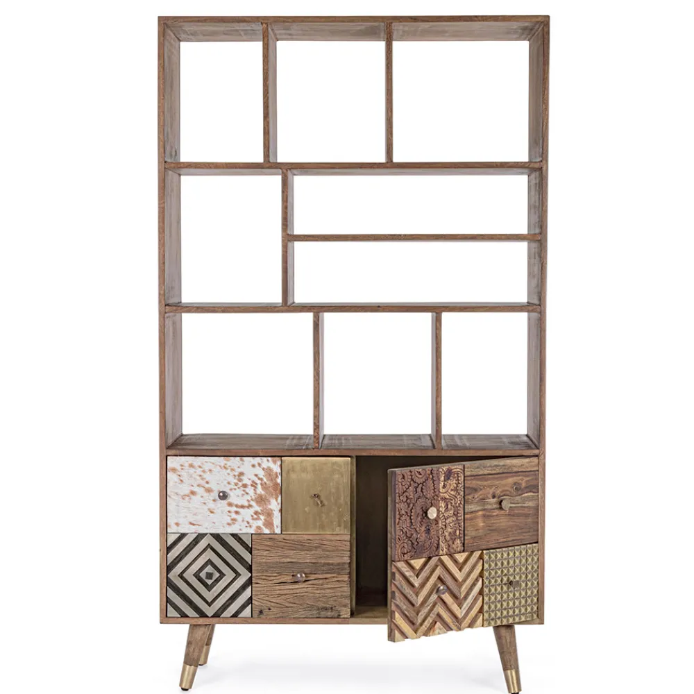 Freistehendes Bücherregal aus Mangoholz mit recycelten Türen und Stahlgriffen.