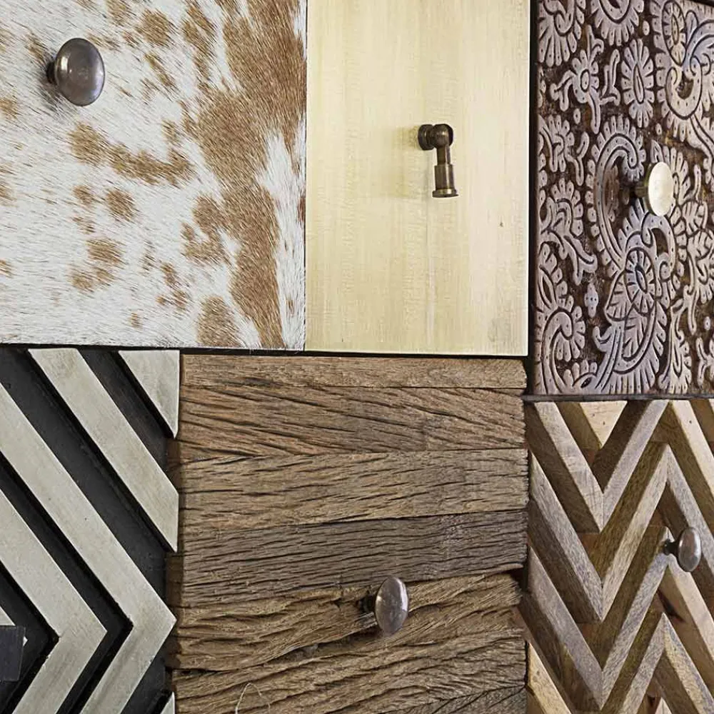 Die Front der Türen besteht aus recyceltem Mango- und Akazienholz mit wasserbasierter Lackierung.