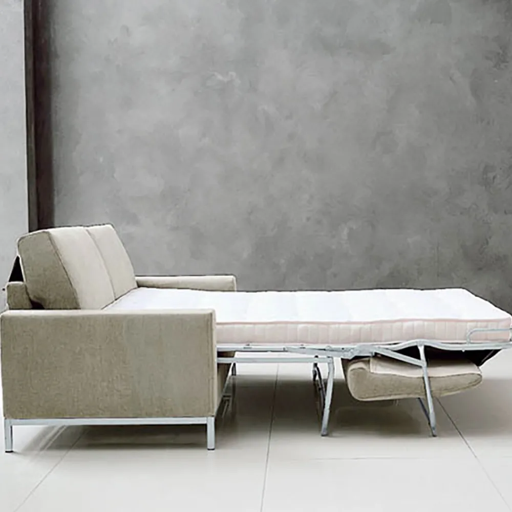Schlafsofa für das Wohnzimmer mit einer Struktur aus Massivholz, Sperrholz, Holzkonglomerat und Füllung aus Rohholzfaserplatten . Die Polsterung der Struktur selbst besteht aus Polyurethanschaum D.40 aus Polyesterfaser . Federn mit elastischen Gurten mit kontrollierter Elastizität sind in einem gekreuzten System montiert. Mechanismus aus hochfesten Stahlrohren und elektrogeschweißtem Metallgeflecht.