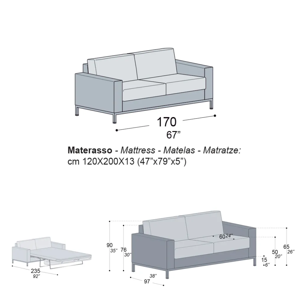 - Länge: 210 x Tiefe: 97 x Höhe: 90 cm – Bonnel-Matratze: Länge: 160 x Tiefe: 200 x Höhe: 13 cm