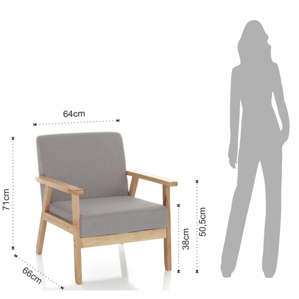 Sessel mit gepolstertem Sitz und Rückenlehne , bezogen mit nicht abnehmbarem grauem Stoff und Struktur aus massivem Kiefernholz , vollständig .