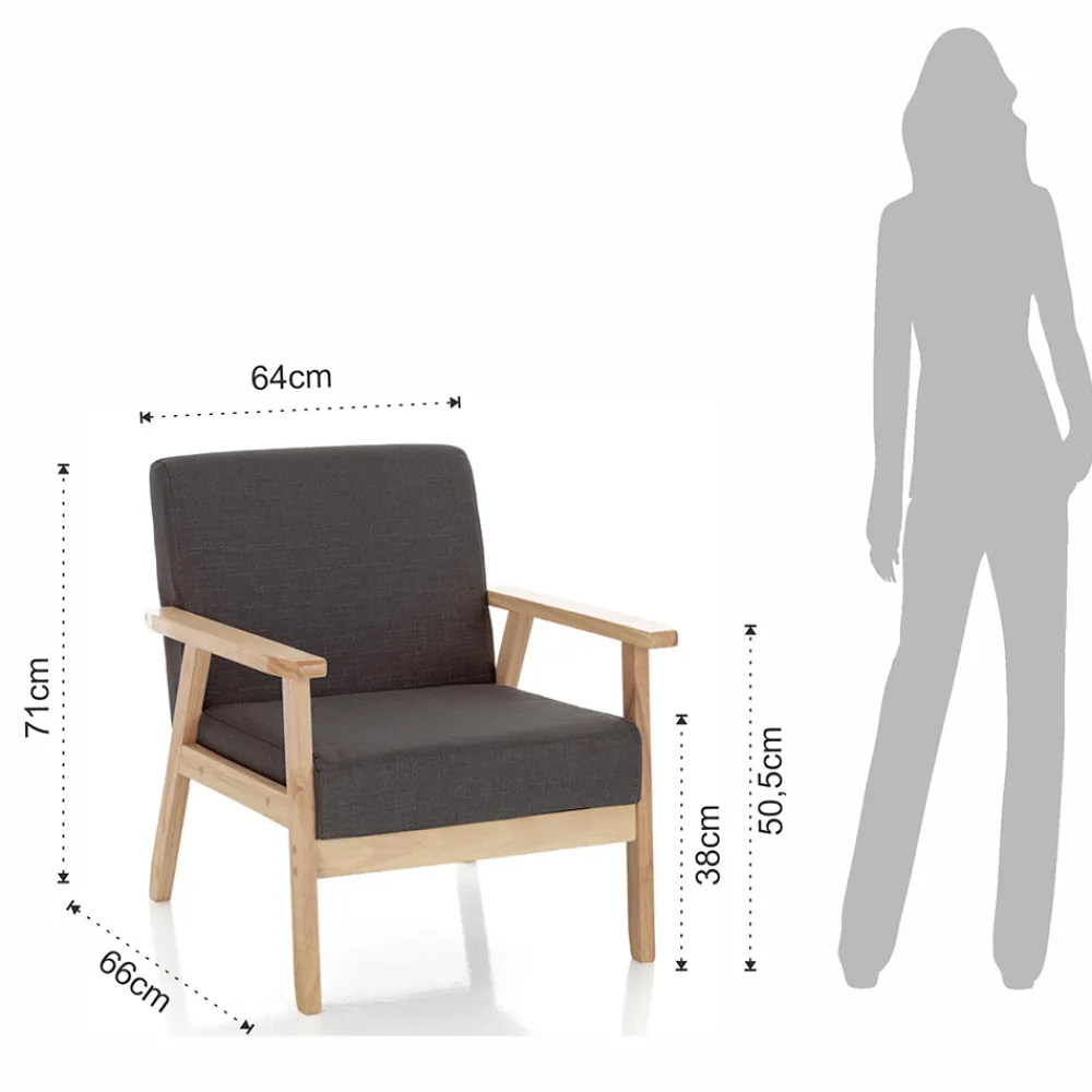 Sessel aus massivem Kiefernholz , gepolsterter Sitz und Rückenlehne mit dunkelgrauem, nicht abnehmbarem Stoff bezogen.