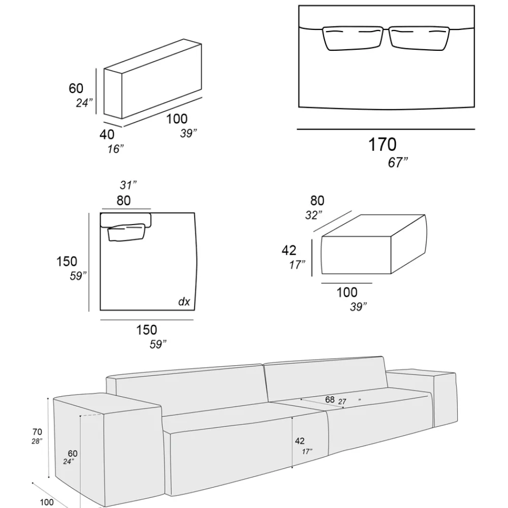 - Sofa – Länge 170 x Tiefe: 100 x Höhe: 70 cm – Sitzhöhe: 42 cm