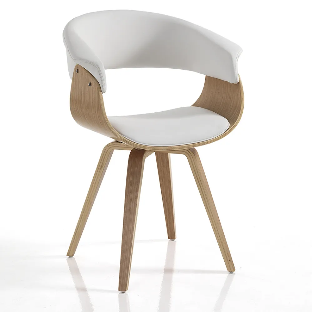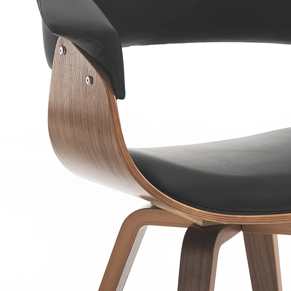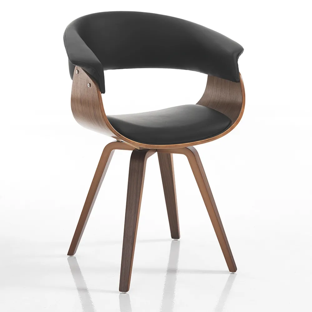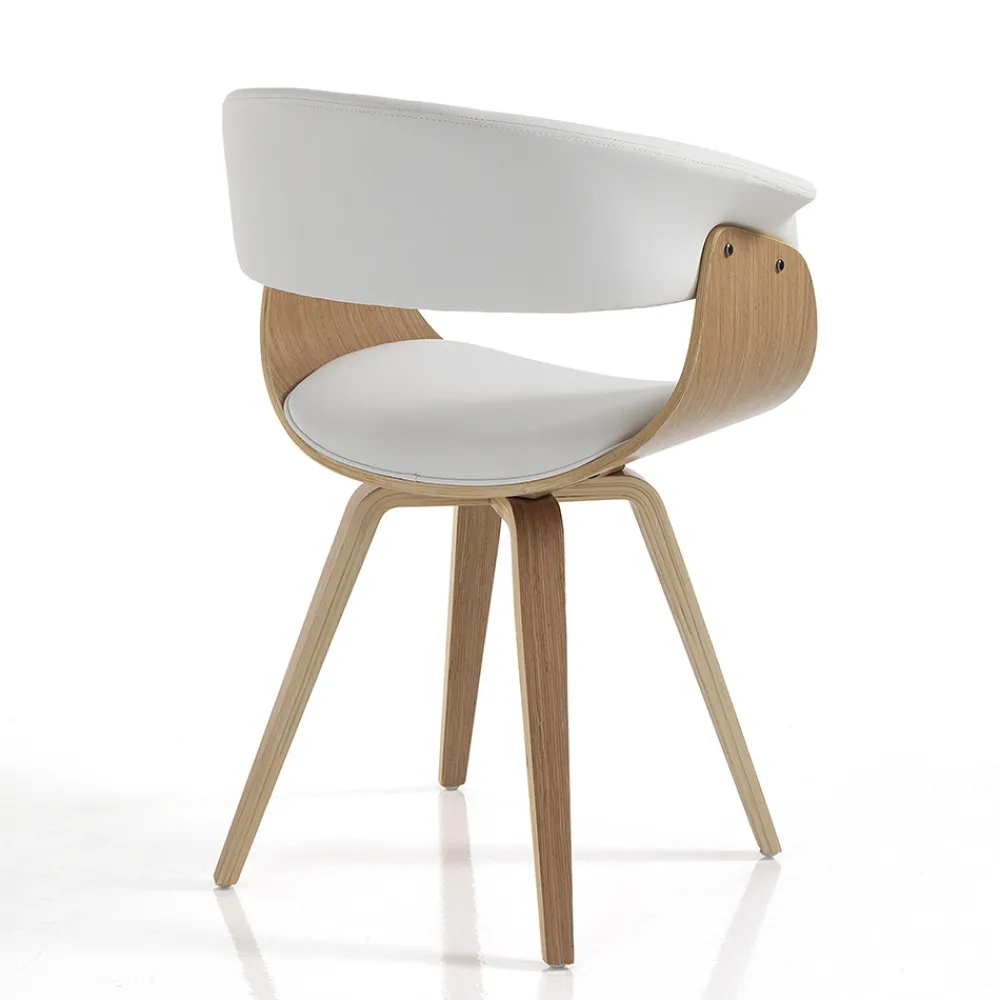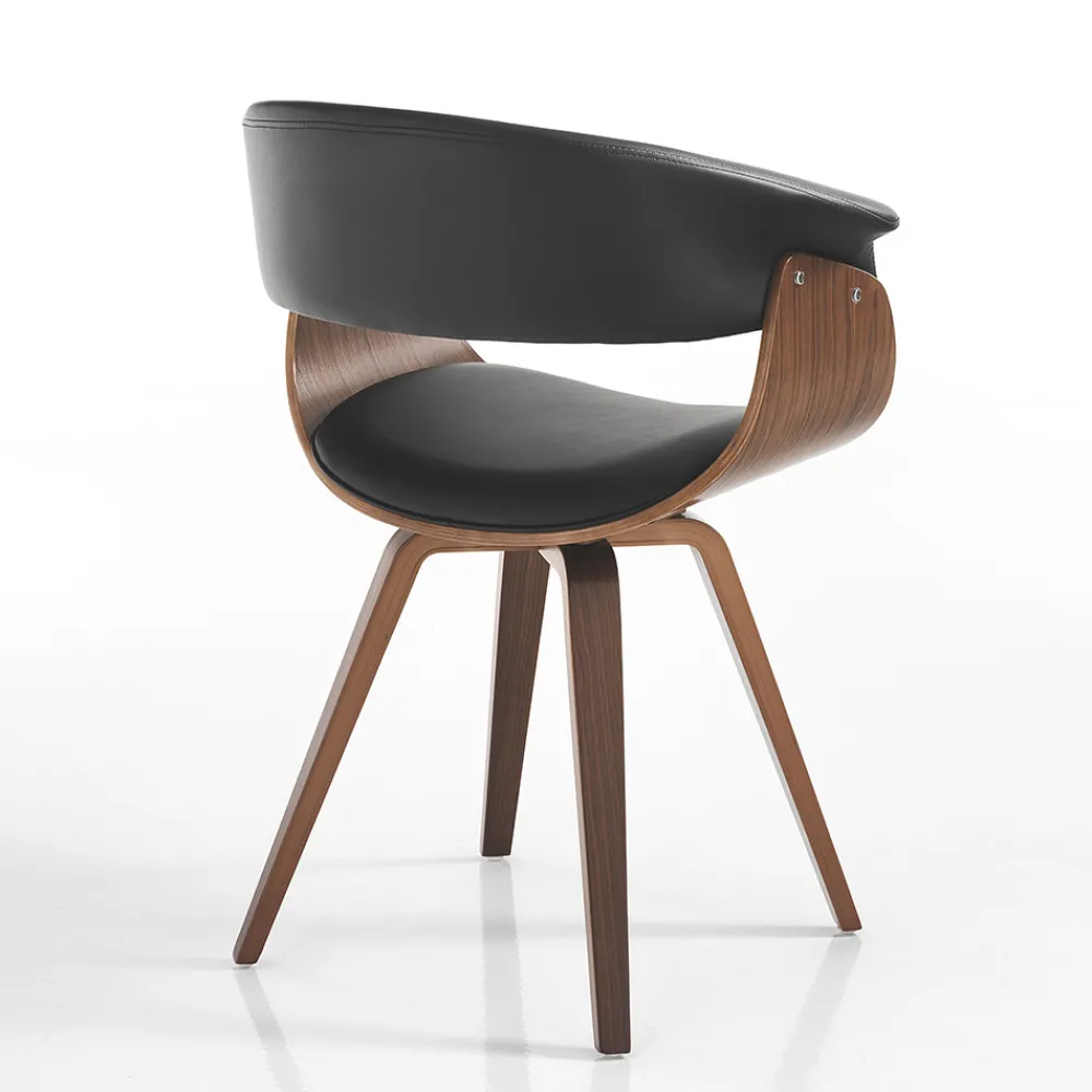 Esszimmerstuhl mit Struktur aus Sperrholz und Einsätzen aus Kunstleder . Ein einzigartiger und faszinierender Stil zeichnet diesen Sitz aus, dessen Ästhetik von weichen Formen und abgerundeten Linien geprägt ist , die ein komfortables und einhüllendes Produkt gewährleisten und daher ideal für die funktionale Ergänzung von Esszimmern oder Küchen mit modernen Möbeln geeignet sind. Die wundervolle Kombination der imposanten Holznote und der zeitlosen Eleganz des Leders lässt einen originellen , avantgardistischen Stuhl mit einer starken zeitgenössischen Persönlichkeit entstehen .