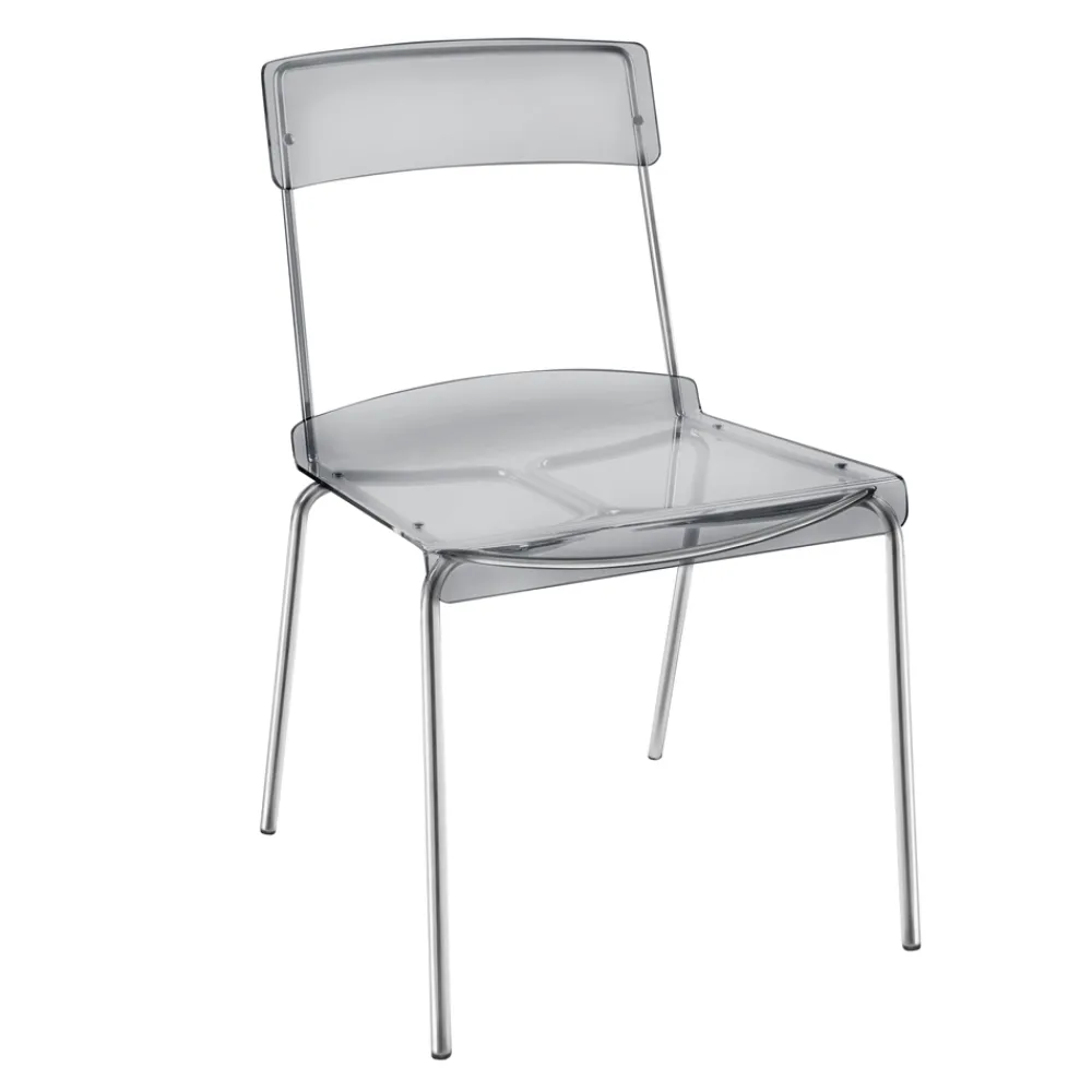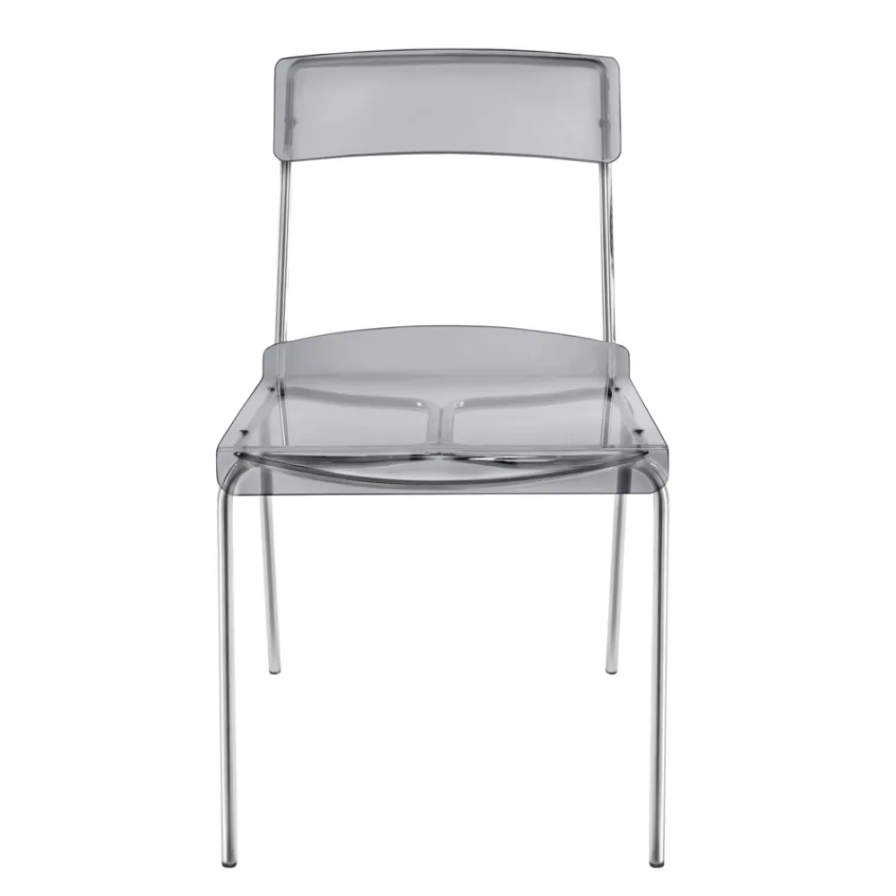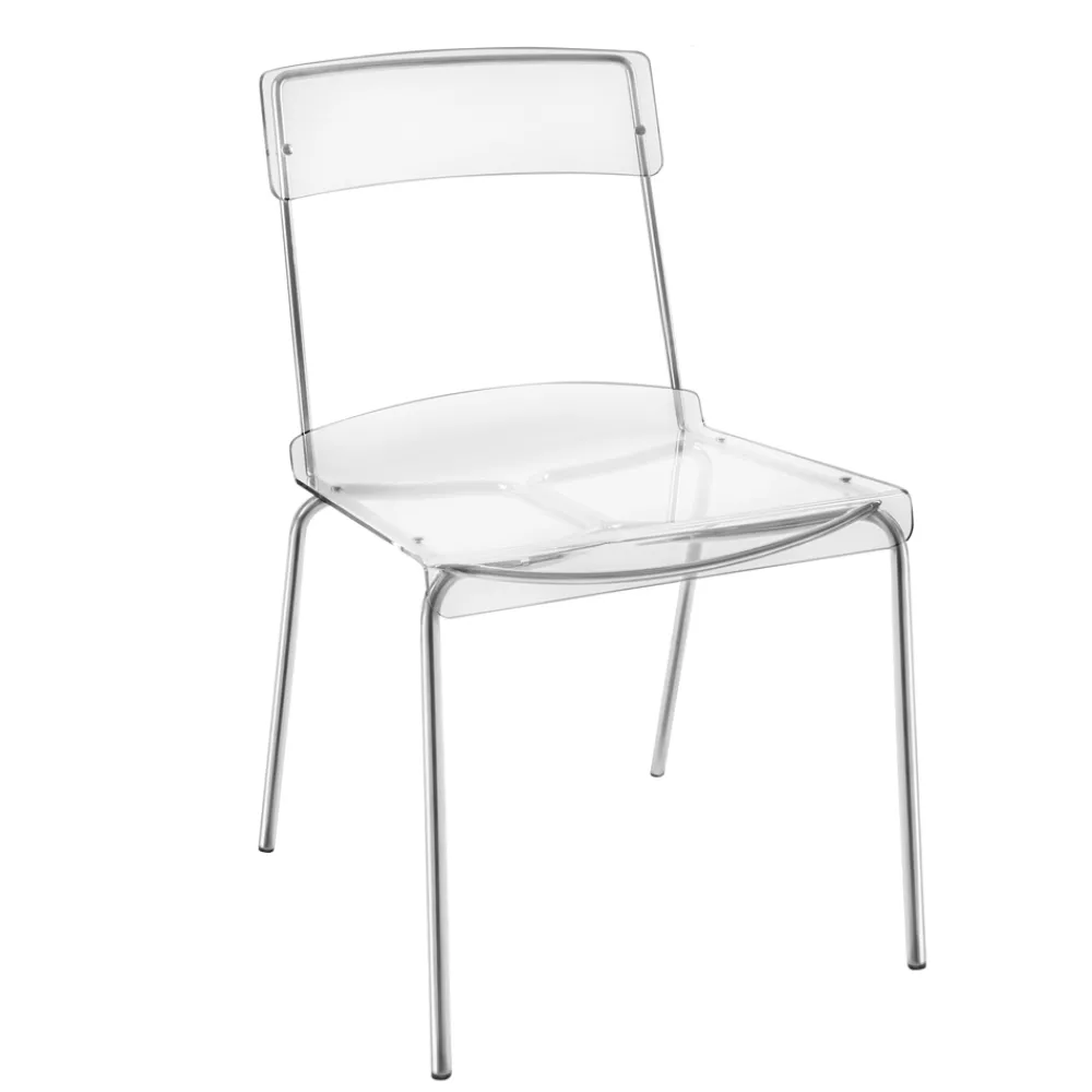 Esszimmerstuhl mit Plexiglasschale und silberverchromter Metallstruktur , vollständig in Italien hergestellt . Eine ideale Einrichtungslösung für alle, die Einfachheit und Vielseitigkeit suchen, um ihre Wohnräume mit modernem Charakter und hoher Funktionalität einzurichten . Die Form der Struktur ermöglicht es auch, sie zu stapeln, was sie auch zu einer perfekten Idee für Vertragsräume wie Bars und Restaurants macht.