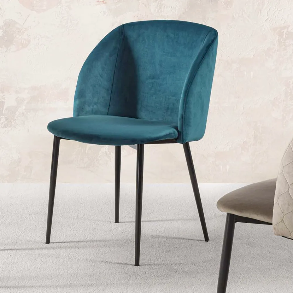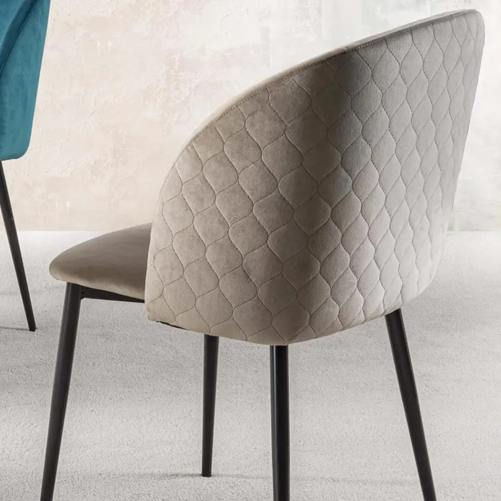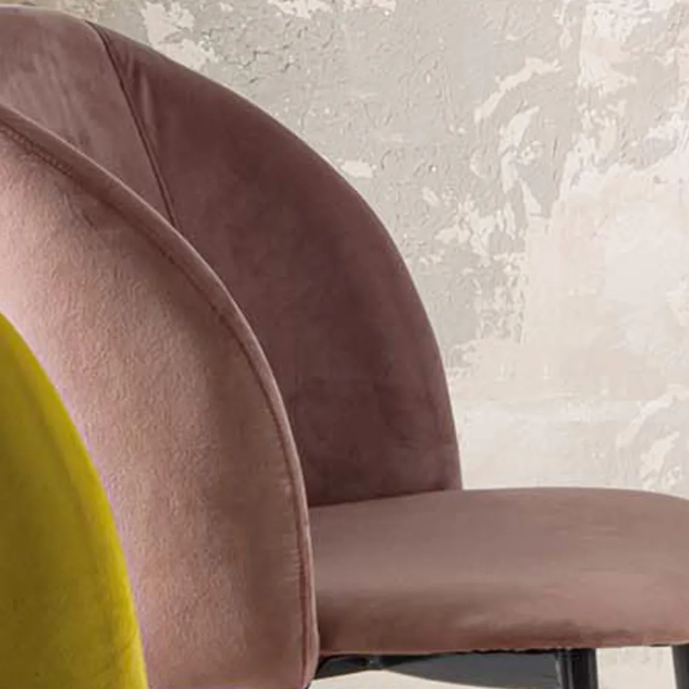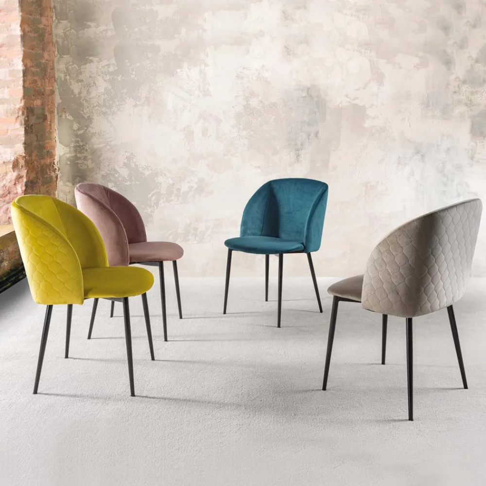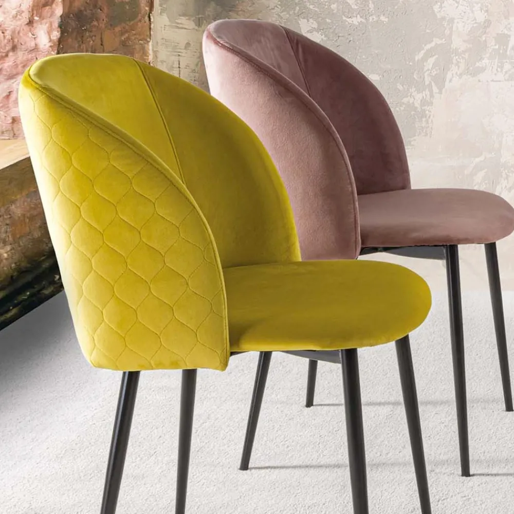 Stuhl für Esszimmer oder Küche aus schmutzabweisendem Samt mit schwarz lackierten Metallbeinen . Farbe, Lebendigkeit und eine starke Persönlichkeit zeichnen diesen raffinierten Stuhl aus, der mit einer geschwungenen Rückenlehne ausgestattet ist, die unvergleichlichen Komfort sowie einen bequemen und besonders einladenden Sitz bietet . Dank der Möglichkeit, zwischen der Version mit gesteppter und der glatten Rückenlehne zu wählen, kann es auf jeden Bedarf reagieren, indem es sowohl einen Artikel mit einer attraktiven und modernen Ästhetik als auch eine nüchternere und diskretere Variante anbietet, die sich auch als äußerst zuverlässig erweisen vielseitig .