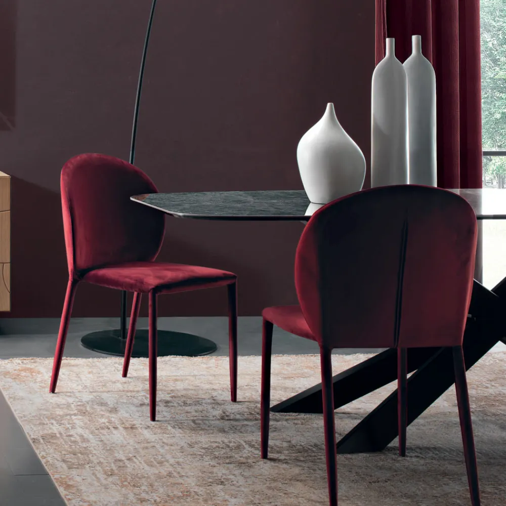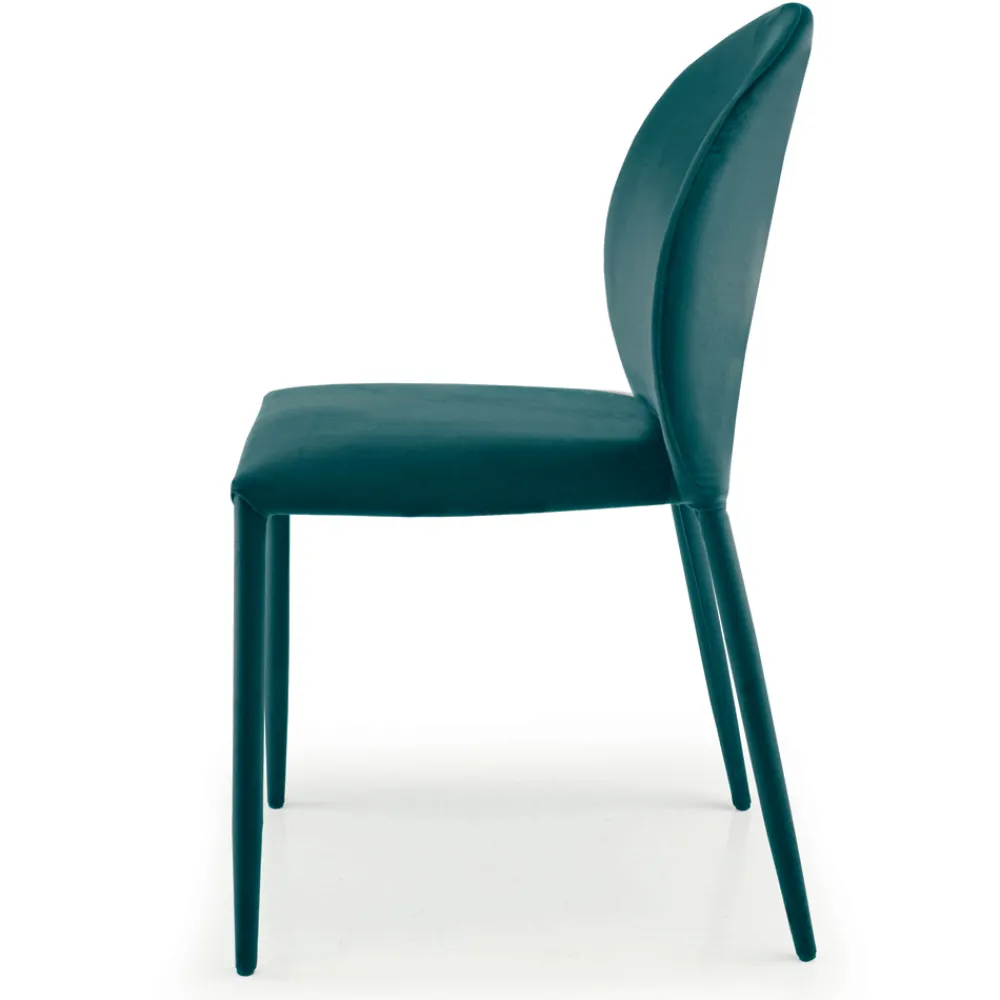 In Italien hergestellter Esszimmerstuhl mit vollständig mit Samt bezogener Stahlstruktur . Ein Sitz, der aus dem Wunsch heraus entstanden ist, die perfekte Kombination aus Komfort und Design zu schaffen, um so den Anforderungen derjenigen gerecht zu werden, die eine exklusive und raffinierte Ästhetik lieben, aber auch denen, die bequeme Formen und Linien suchen. Das Ergebnis ist dieser wundervolle moderne Stuhl, der sich durch eine abgerundete Rückenlehne auszeichnet, die das Gefühl einer warmen und weichen Umarmung vermittelt und ideal ist, um beim Mittag- und Abendessen mit Freunden optimalen Komfort zu gewährleisten. Die Eleganz des Samts verleiht dem Stuhl auch seine ganze moderne Persönlichkeit , perfekt für alle, die einen einzigartigen Stil und gleichzeitig die Funktionalität eines einladenden Sitzes suchen.