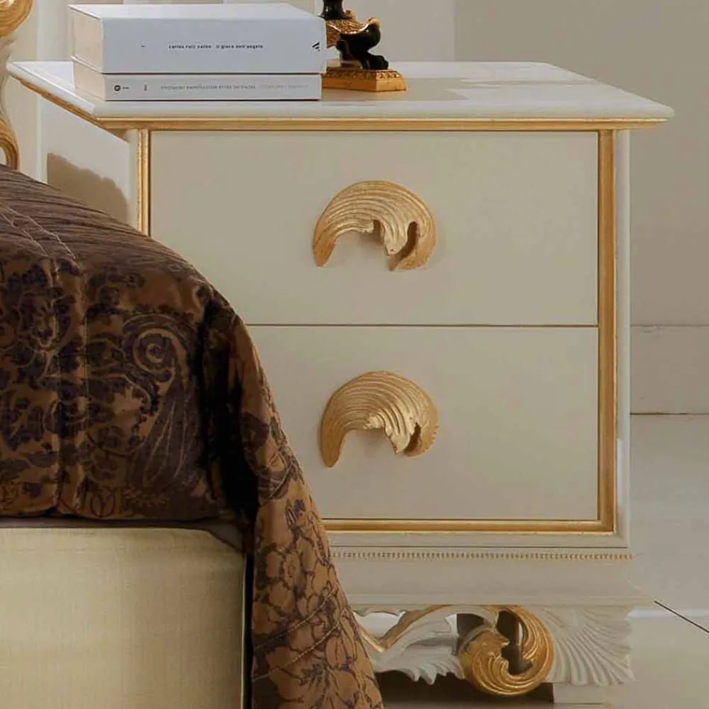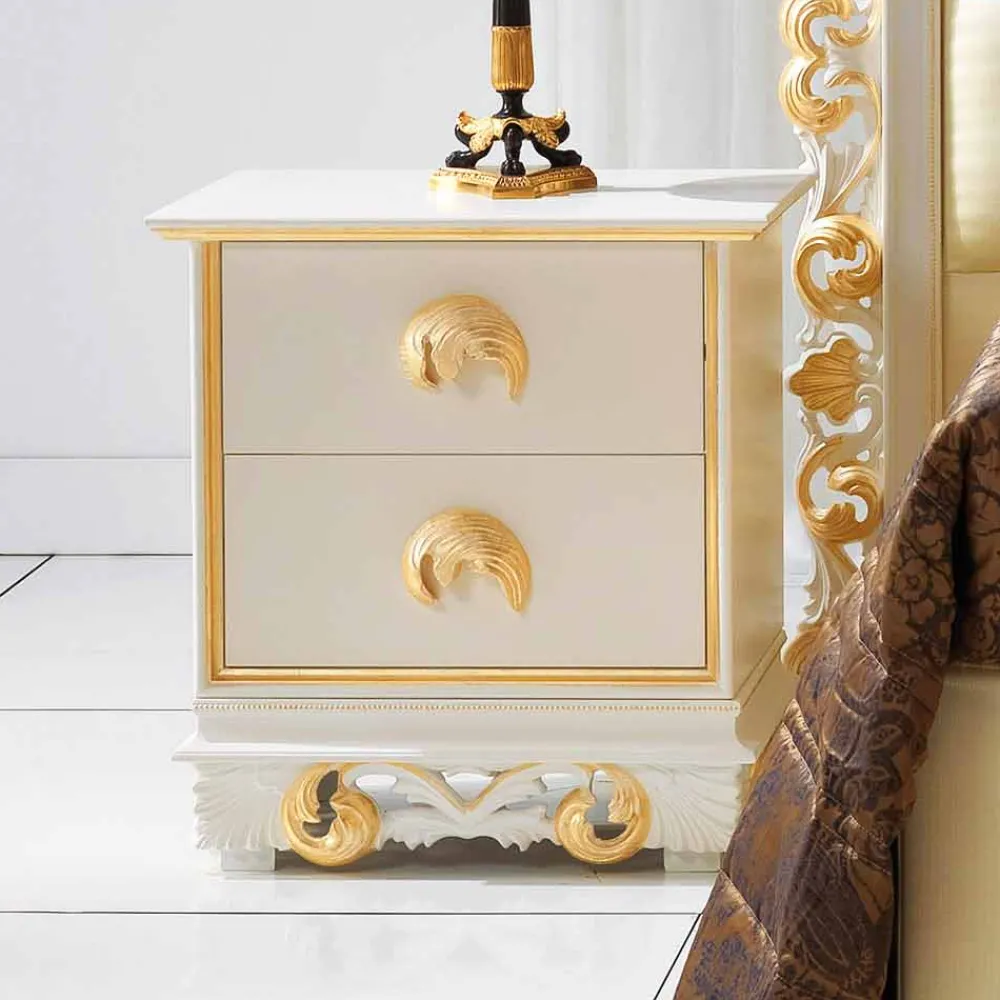 Ein stilvoller Schlafzimmer Nachtschrank, für diejenigen die es rustikal oder klassisch mögen. Toskanische Einrichtungsgegenstände im originalen Barock Stil. Es handelt sich bei dem Nachtschrank um ein in Handarbeit gefertigtes Produkt, dass mit viel Liebe zum Detail geschaffen wurde und einen Hauch von mediterraner Klassik verbreitet. Die Struktur besteht aus hochwertigen Holz und verschafft mit seinen 2 Schubladen für ausreichende Stauraummöglichkeiten. Die Scharnieren der Schubladen besitzen einen innovativen Schließmechanismus mit Dämpfungssystem, diese bilden die Basis für ein geräuschloses und sanftes Schließen. Das Oberflächenfinish in antique creme patinee mit vergoldeten Schubladengriffen und prunkvollen Verzierungen versehen, verleiht dem Nachttisch einen französisch barocken Stil.