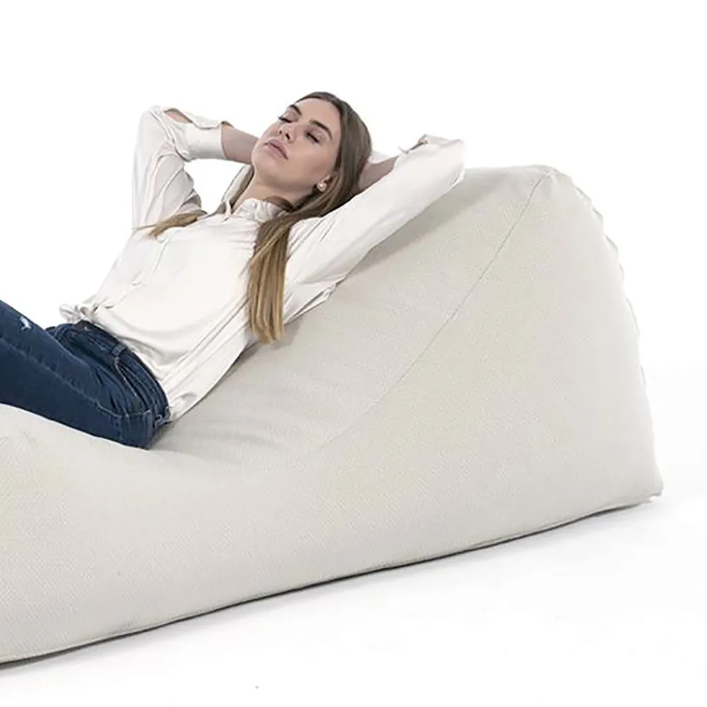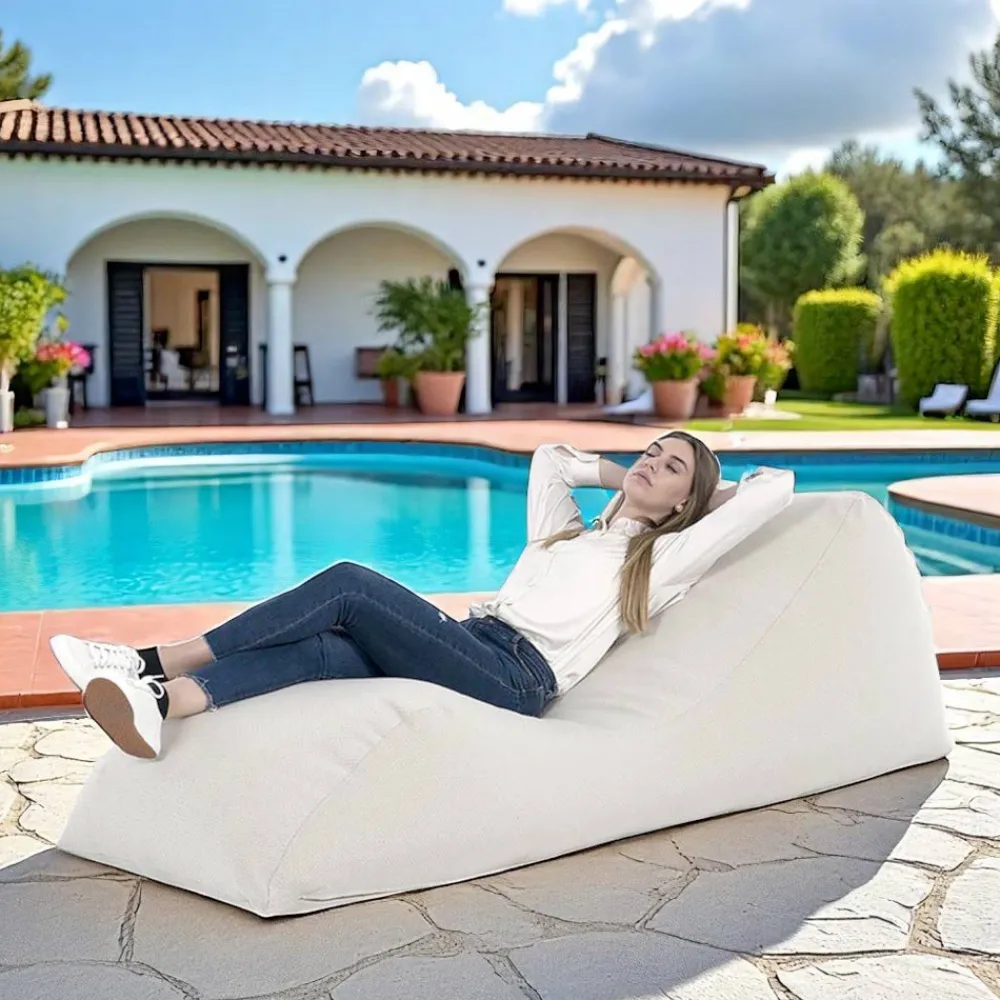 Diese Liege aus weißem Leinen ist die perfekte Definition kompromissloser Entspannung . Ihre ergonomische Form passt sich auf natürliche Weise dem Körper an und bietet ideale Unterstützung für Momente puren Wohlbefindens im Freien , vom Lesen bis zum Mittagsschläfchen.