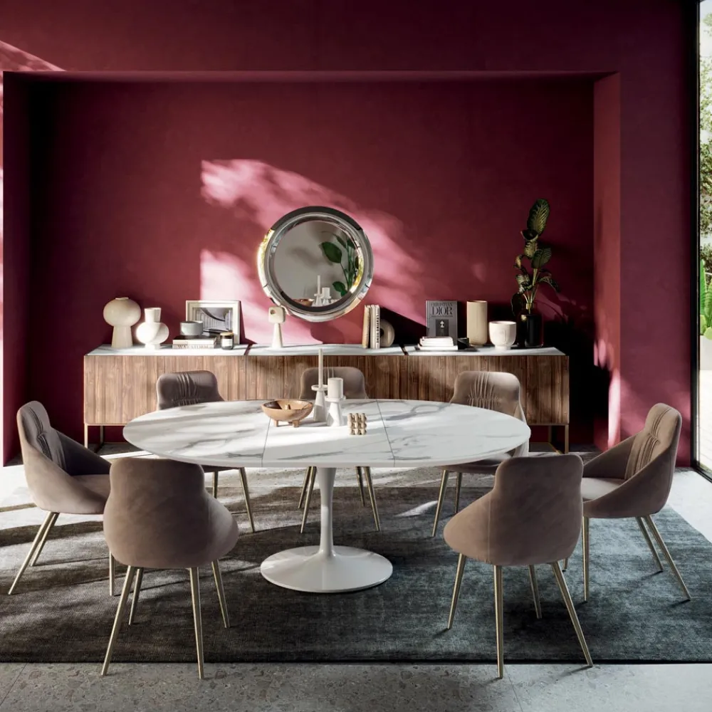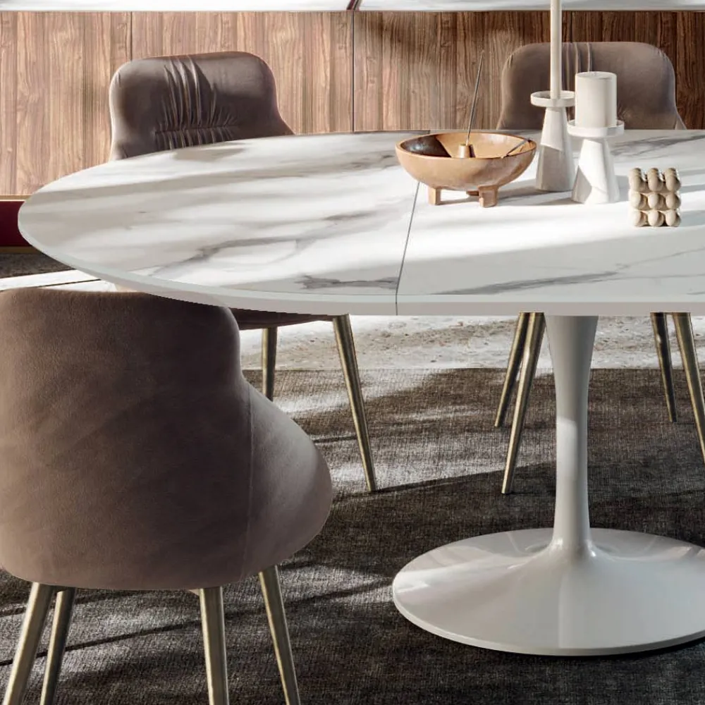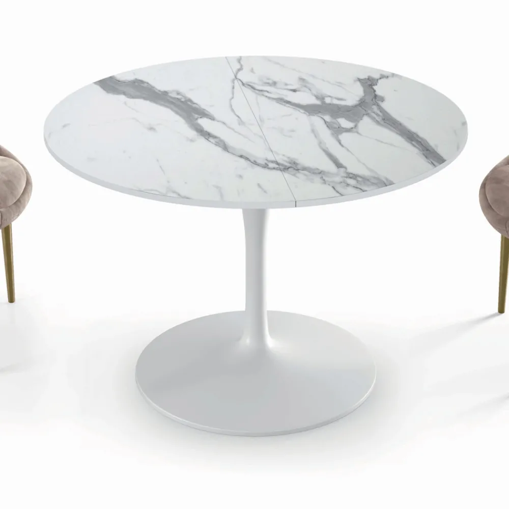 Ausziehbarer Wohnzimmertisch mit separaten Verlängerungen zum Einsetzen, Laminatplatte mit mattem Statuenfinish, 45° abgeschrägte Kante, Untergestell aus glänzend weiß lackiertem Aluminiumguss.