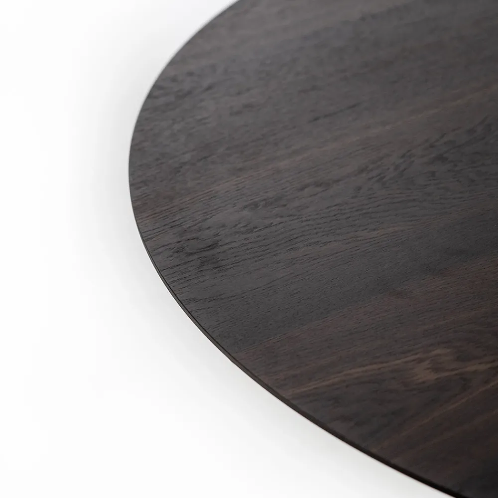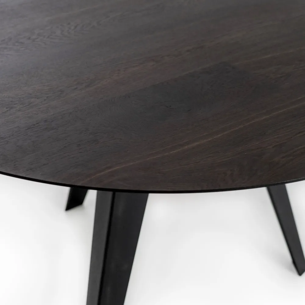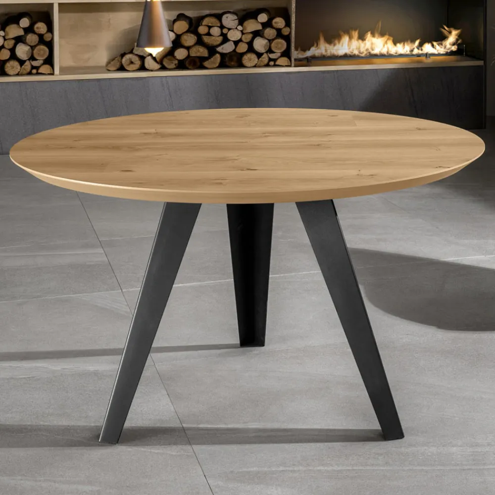 Runder Wohnzimmertisch mit Platte aus Eichenfurnier und Metallbeinen .