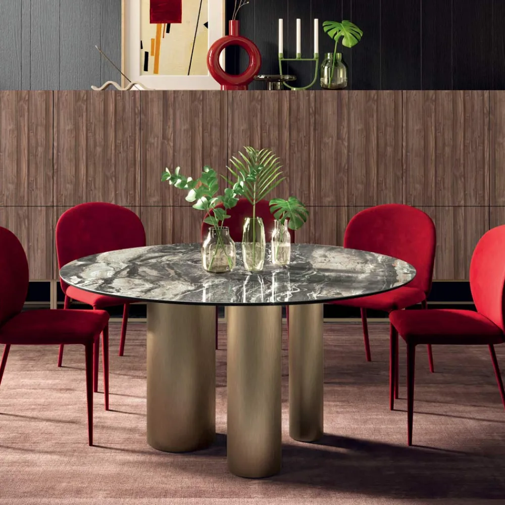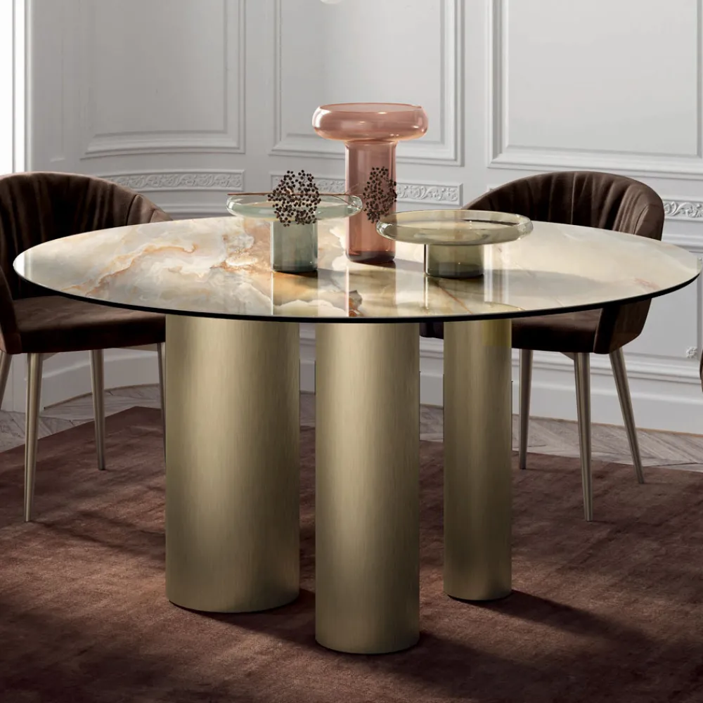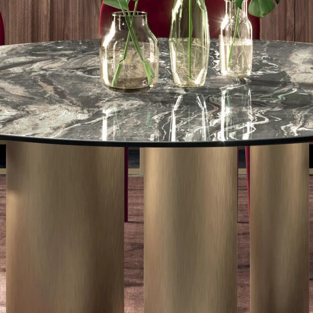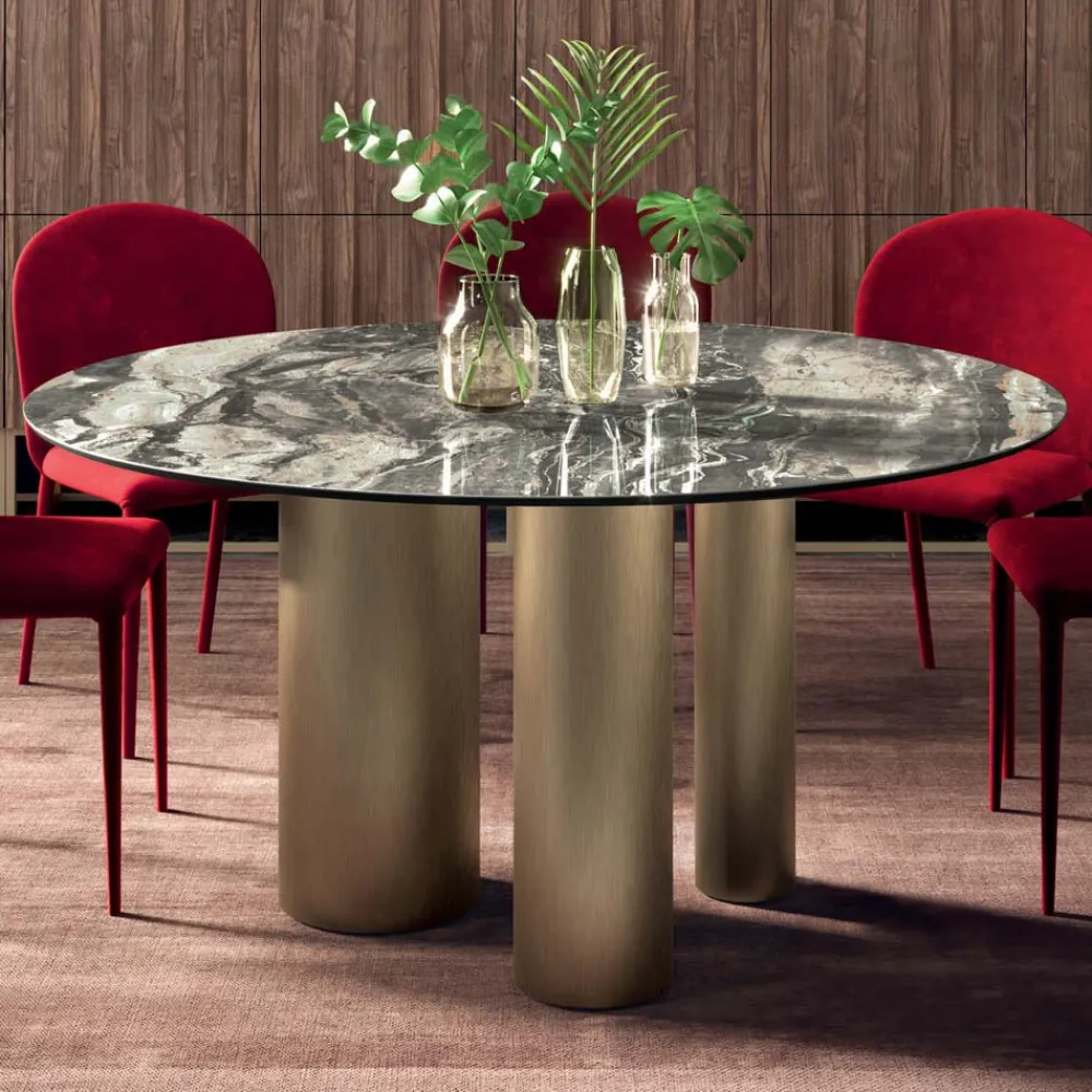 Das charakteristische Element dieses Produkts ist die Basis, die aus drei Zylindern unterschiedlicher Größe besteht, die ihm eine einzigartige Eleganz und Raffinesse verleihen. Dieser Tisch kann jede Alltags- und Objektumgebung vervollständigen und personalisieren und so den unterschiedlichsten Designanforderungen am besten gerecht werden. Es wird vollständig in Italien hergestellt , wobei hochwertige Materialien ausgewählt und auf jedes einzelne Detail geachtet wird.