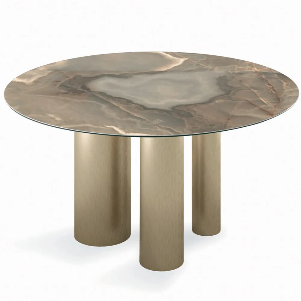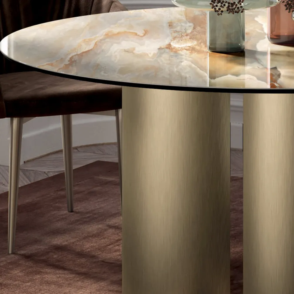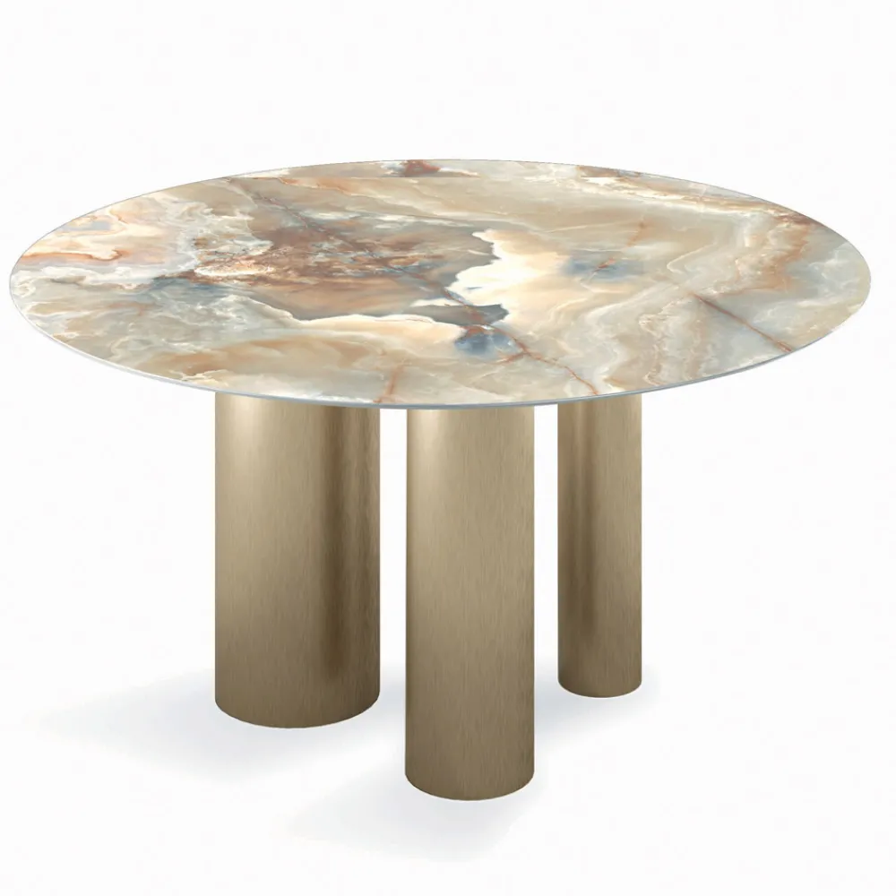 Runder fester Wohnzimmertisch mit Keramikplatte , 45° abgeschrägter Kante, Sockel aus champagnerfarben lackiertem Stahl und verstellbaren Füßen.