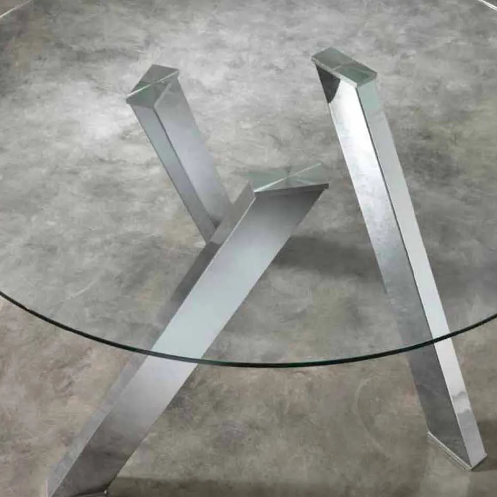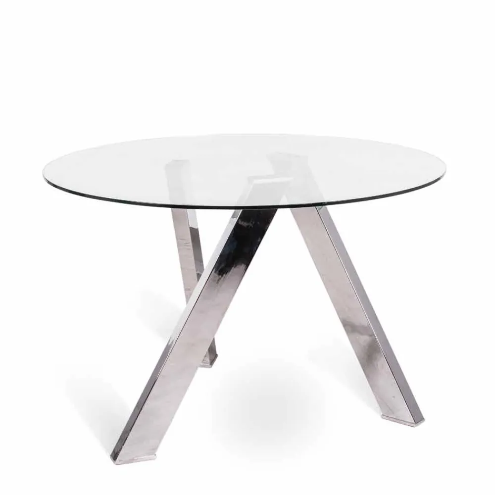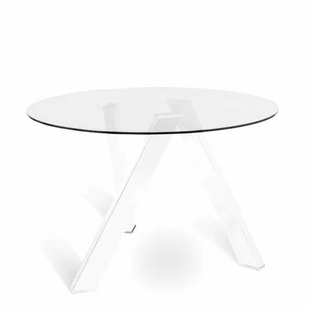 Tisch mit Sockel aus weiß lackiertem Metall oder Stahl und Tischplatte aus transparentem gehärtetem Glas.