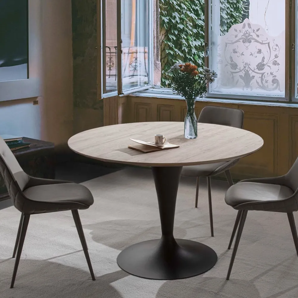 Wunderschöner Esstisch mit runder Platte aus plattiertem Laminat (H 30 mm), strukturierte Eiche mit ausgestelltem Rand in mdf und sockel aus schwarz lackiertem stahl . Eleganz und Funktionalität sind die Schlüsselwörter, die dieses moderne Möbelstück am besten beschreiben, das ein äußerst zeitgemäßes Aussehen verkörpert, das die Ästhetik des Raums bereichern kann, während es eher kleine Abmessungen beibehält und sich daher als ideal für diejenigen erweist, die nur über begrenzte Räume verfügen, aber nicht geben möchten sie auf raffinierte und elegante Weise einzurichten. Dieser Tisch ist ideal für die Vervollständigung jeder Umgebung mit Nüchternheit und dank der perfekten Kombination aus einfachen und wesentlichen Oberflächen äußerst vielseitig .