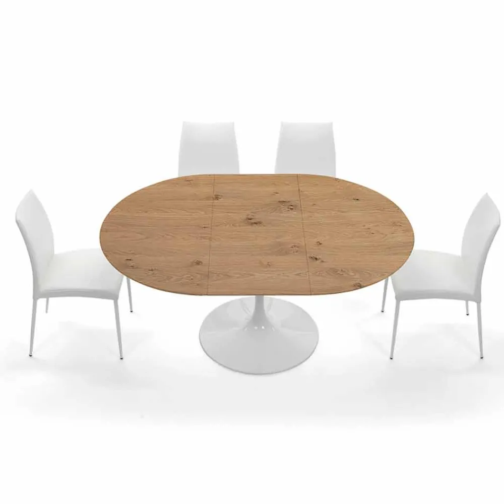 In Italien hergestellter Esstisch mit runder ausziehbarer Platte aus furniertem Holz und Untergestell aus glänzend weiß lackiertem Aluminiumguss . Die zeitlose Eleganz des Holzes und seiner wunderbaren Maserung verschmilzt mit der modernen und exklusiven Ästhetik des lackierten Metalls und erweckt ein revolutionäres Ergebnis zum Leben, das jeden Raum im Haus charakterisieren kann und ihm seine starke zeitgenössische Persönlichkeit verleiht. Der Tisch hat auch eine starke funktionale Seite, ein Element, das durch die ausziehbare Tischplatte entsteht, die dank einer externen Verlängerung um 50 cm eine Länge von 170 cm erreicht und so die Möglichkeit bietet, bis zu 8 Personen zu bewirten und wunderbare Mittag- und Abendessen in Gesellschaft zu organisieren.