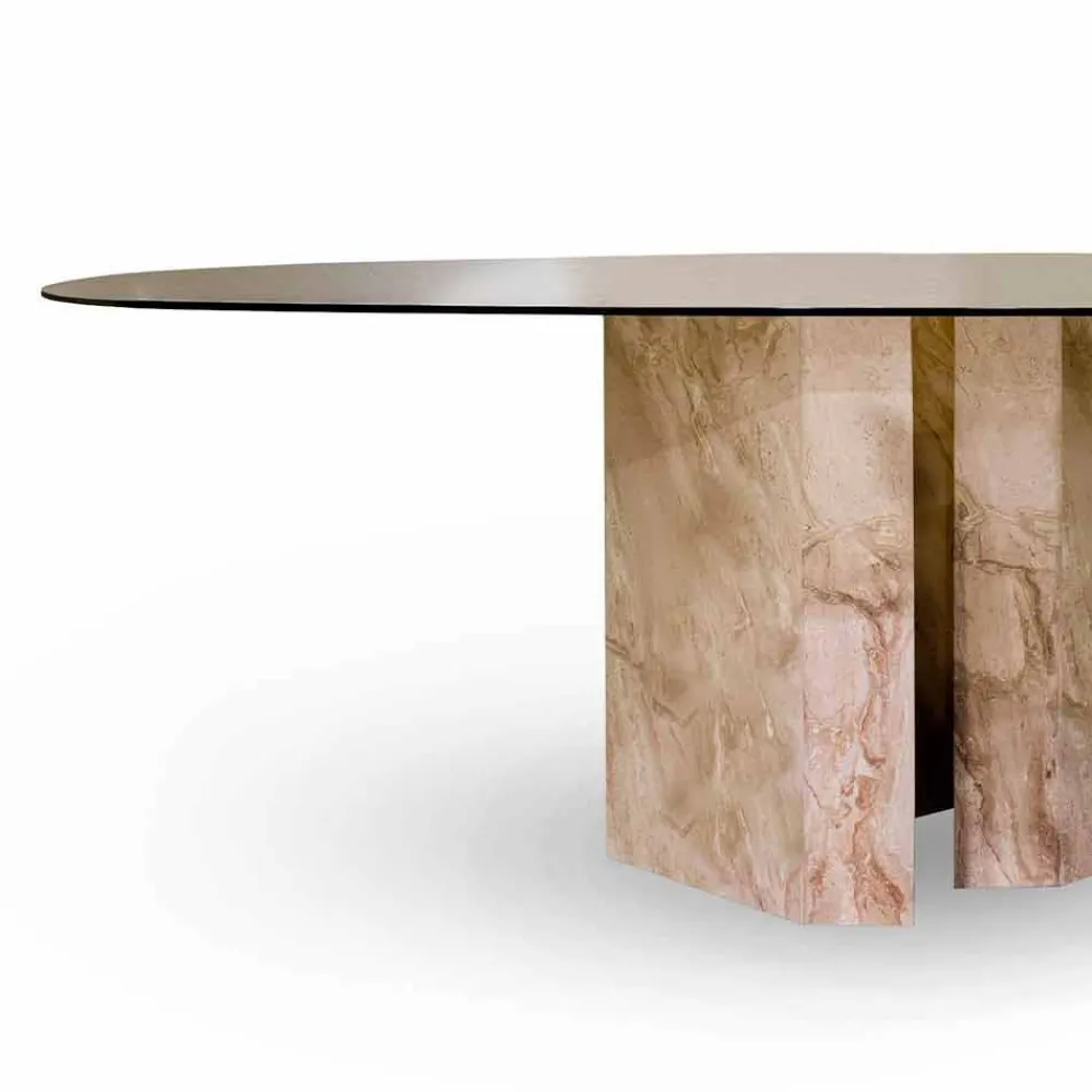Ellipsentisch mit Tischplatte aus Kristall und Tischgestell aus Marmor Beige-Koralle, made in Italy: Noccia