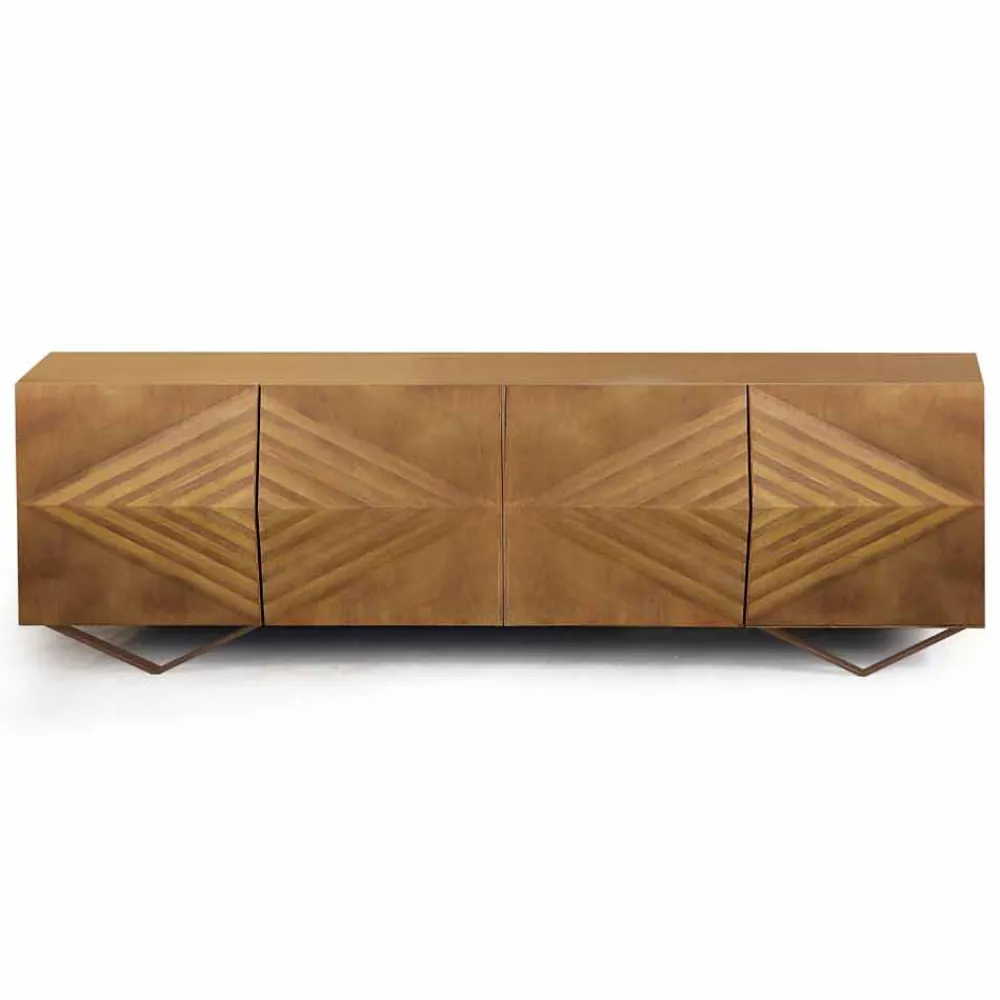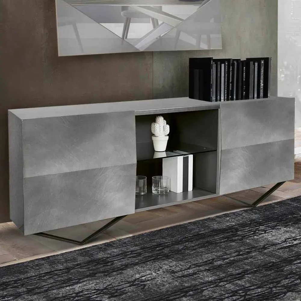 Sideboard made in Italy mit lackierter Holzstruktur , 2 oder 4 Türen aus naturbelassenem oder lackiertem Facettenholz, Innenregale (und offenes Fach) aus transparentem Glas und Sockel aus lackiertem Stahl . Ein exklusives Design , das Funktionalität und Eleganz verkörpert , um ein vielseitiges Möbelstück zum Leben zu erwecken , ideal für jede Wohnumgebung , in der es dank seiner starken modernen Persönlichkeit und seines ausgeprägten raffinierten Stils eine wunderbare Harmonie mit den umgebenden Elementen schafft . Die verwendeten Materialien steigern seinen Wert noch mehr und unterstreichen seine Qualität, indem es ein solides und robustes Möbel für den Wohnbereich bietet, das sich durch die einzigartigen Eigenschaften des Holzes und seine prächtigen Maserungen auszeichnet.