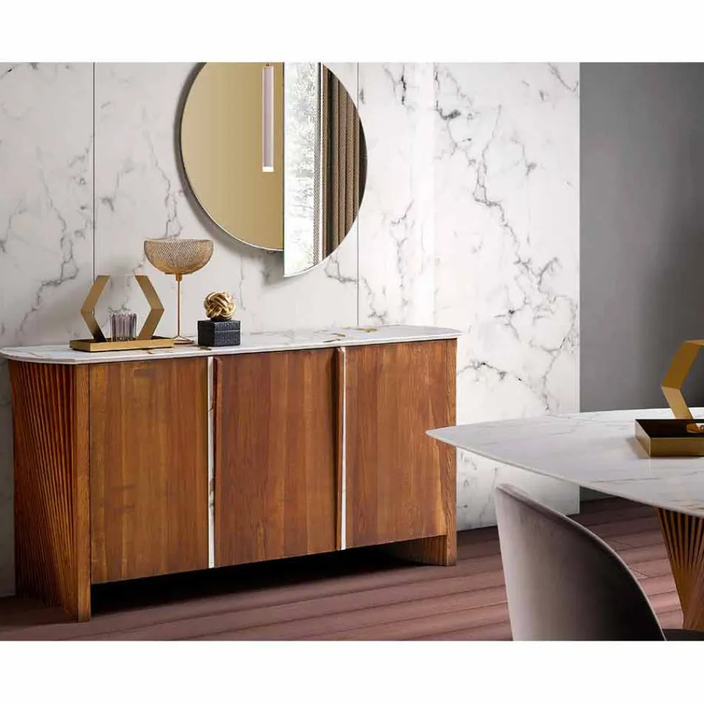 Sideboard mit Holzstruktur und Details aus Steinzeug mit Marmoreffekt, ein Luxusartikel Made in Italy.