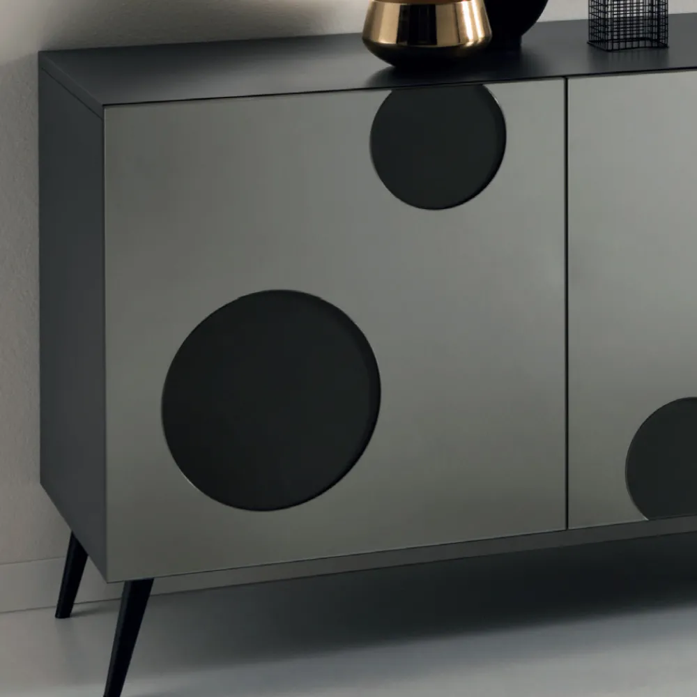 Modernes Sideboard mit Struktur aus Melamin mit Anthrazit-Finish , 3 Holztüren , bereichert durch elegante Einsätze aus Glas mit Spiegeleffekt und Sockel oder Füße aus schwarz lackiertem Metall . Ein Produkt, das aus einer 100% Made in Italy-Produktion durch die Verwendung hochwertiger Rohstoffe stammt, eine elegante dekorative Ergänzung für den Wohnbereich, die Funktionalität und eine faszinierende und avantgardistische Ästhetik bietet und sich als perfekte Einrichtungslösung für diejenigen erweist, die suchen für ein raffiniertes und funktionales Möbelstück zugleich.