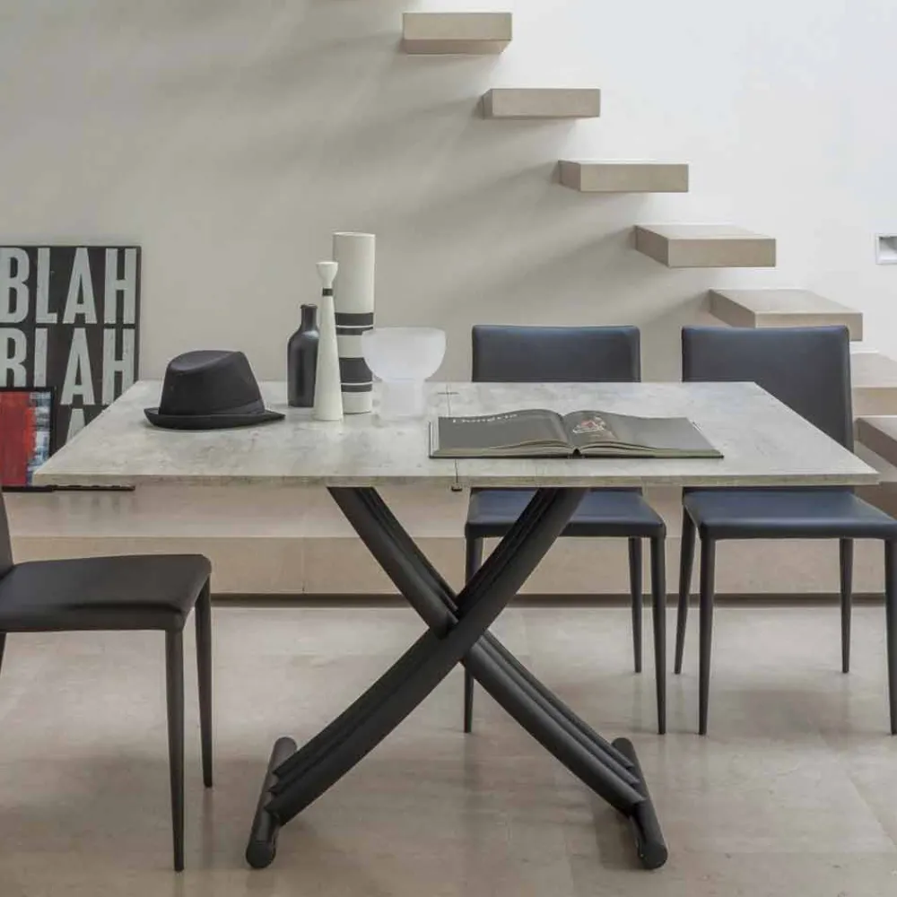 Der in einen Esstisch umwandelbare Couchtisch zeichnet sich durch die Möglichkeit aus, seine Höhe dank eines Gasmechanismus von 22 cm bis 77 cm zu verstellen. Es verfügt außerdem über ein doppelt faltbares Verdeck und einziehbare Räder.